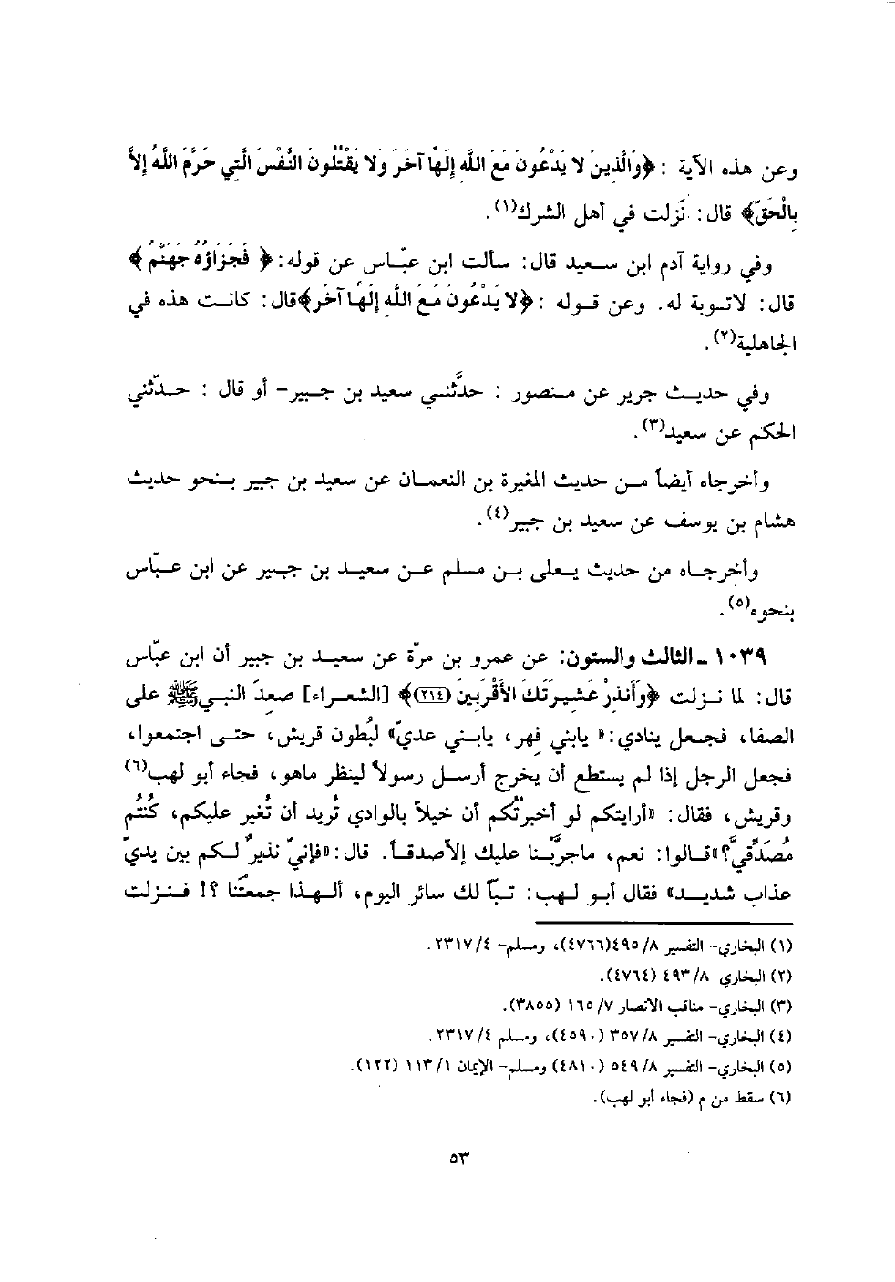 1039 - الثَّالِث وَالسِّتُّونَ: عَن عَمْرو بن مرّة عَن سعيد بن جُبَير أَن ابْن عَبَّاس قَالَ: لما نزلت {وأنذر عشيرتك الْأَقْرَبين} [الشُّعَرَاء] صعد النَّبِي صلى الله عَلَيْهِ وَسلم على الصَّفَا، فَجعل يُنَادي: " يَا بني فهر، يَا بني عدي " لبطون قُرَيْش، حَتَّى اجْتَمعُوا، فَجعل الرجل إِذا لم يسْتَطع أَن يخرج أرسل رَسُولا لينْظر مَا هُوَ، فجَاء أَبُو لَهب وقريش، فَقَالَ: " أَرَأَيْتكُم لَو أَخْبَرتكُم أَن خيلاً بالوادي تُرِيدُ أَن تغير عَلَيْكُم، كُنْتُم مصدقي؟ " قَالُوا: نعم، مَا جربنَا عَلَيْك إِلَّا صدقا. قَالَ: " فَإِنِّي نذيرٌ لكم بَين يَدي عَذَاب شَدِيد " فَقَالَ أَبُو لَهب: تَبًّا لَك سَائِر الْيَوْم، أَلِهَذَا جمعتنَا؟ ! فَنزلت