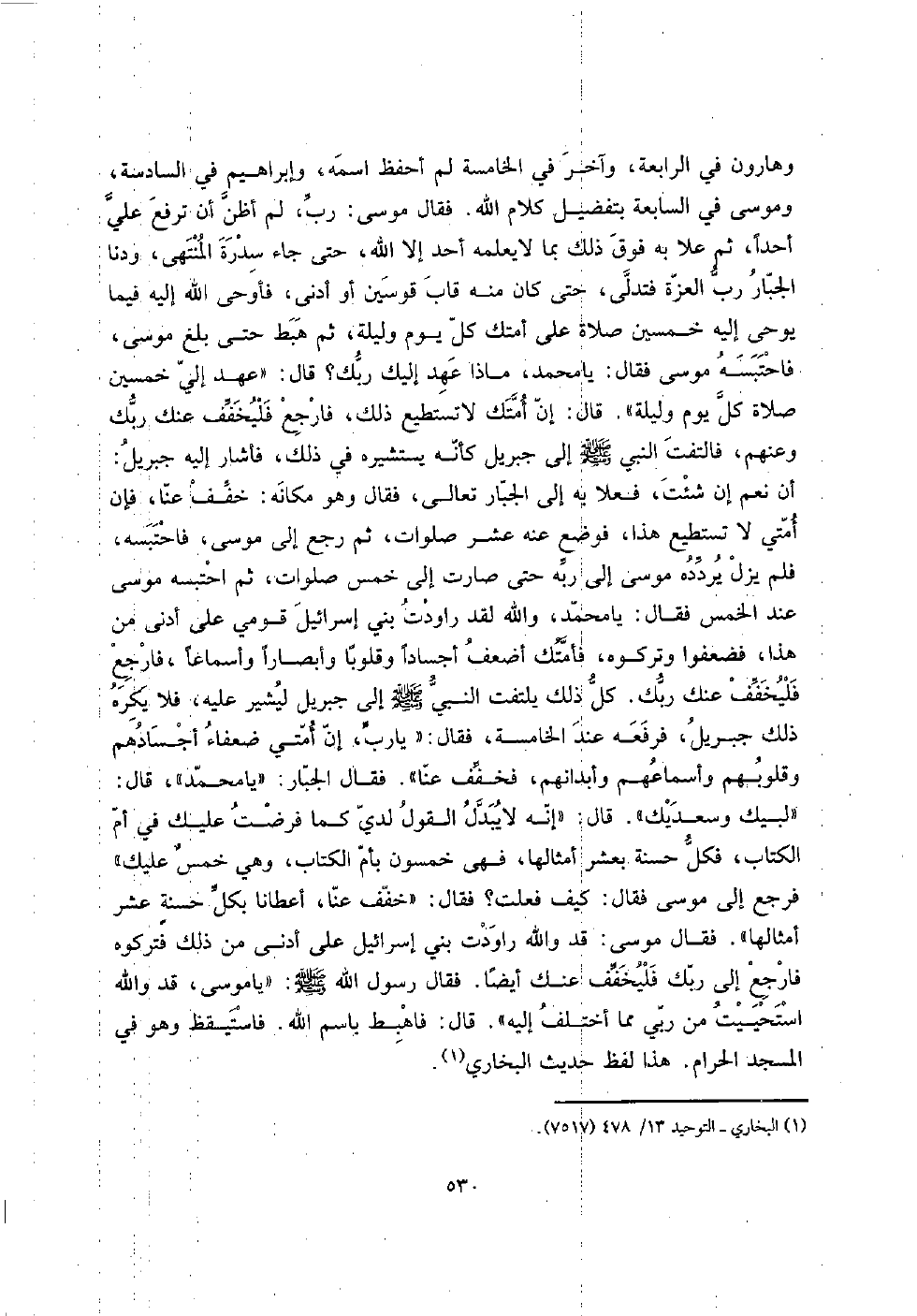 وَهَارُون فِي الرَّابِعَة، وَآخر فِي الْخَامِسَة لم أحفظ اسْمه، وَإِبْرَاهِيم فِي السَّادِسَة، ومُوسَى فِي السَّابِعَة بتفضيل كَلَام الله. فَقَالَ مُوسَى: رب، لم أَظن أَن ترفع عَليّ أحدا، ثمَّ علا بِهِ فَوق ذَلِك بِمَا لَا يُعلمهُ أحد إِلَّا الله، حَتَّى جَاءَ سِدْرَة الْمُنْتَهى، ودنا الْجَبَّار رب الْعِزَّة فَتَدَلَّى، حَتَّى كَانَ مِنْهُ قاب قوسين أَو أدنى، فَأوحى الله إِلَيْهِ فِيمَا يُوحى إِلَيْهِ خمسين صَلَاة على أمتك كل يَوْم وَلَيْلَة، ثمَّ هَبَط حَتَّى بلغ مُوسَى، فاحتبسه مُوسَى فَقَالَ: يَا مُحَمَّد، مَاذَا عهد إِلَيْك رَبك؟ قَالَ: " عهد إِلَيّ خمسين صَلَاة كل يَوْم وَلَيْلَة ". قَالَ: إِن أمتك لَا تَسْتَطِيع ذَلِك، فَارْجِع فليخفف عَنْك رَبك وعنهم، فَالْتَفت النَّبِي صلى الله عَلَيْهِ وَسلم إِلَى جِبْرِيل كَأَنَّهُ يستشيره فِي ذَلِك، فَأَشَارَ إِلَيْهِ جِبْرِيل: أَن نعم إِن شِئْت، فعلا بِهِ إِلَى الْجَبَّار تَعَالَى، فَقَالَ وَهُوَ مَكَانَهُ: خفف عَنَّا، فَإِن أمتِي لَا تَسْتَطِيع هَذَا، فَوضع عَنهُ عشر صلوَات، ثمَّ رَجَعَ إِلَى مُوسَى، فاحتبسه، فَلم يزل يردده مُوسَى إِلَى ربه حَتَّى صَارَت إِلَى خمس صلوَات، ثمَّ احتبسه مُوسَى عِنْد الْخمس فَقَالَ: يَا مُحَمَّد، وَالله لقد راودت بني إِسْرَائِيل قومِي على أدنى من هَذَا، فضعفوا وتركوه، فأمتك أَضْعَف أجساداً وَقُلُوبًا وأبصاراً وأسماعاً، فَارْجِع فليخفف عَنْك رَبك. كل ذَلِك يلْتَفت النَّبِي صلى الله عَلَيْهِ وَسلم إِلَى جِبْرِيل ليشير عَلَيْهِ، فَلَا يكره ذَلِك جِبْرِيل، فرفعه عِنْد الْخَامِسَة، فَقَالَ: " يَا رب، إِن أمتِي ضعفاء أَجْسَادهم وَقُلُوبهمْ وأسماعهم وأبدانهم، فَخفف عَنَّا ". فَقَالَ الْجَبَّار: " يَا مُحَمَّد "، قَالَ: " لبيْك وَسَعْديك ". قَالَ: " إِنَّه لَا يُبدل القَوْل لدي كَمَا فرضت عَلَيْك فِي أم الْكتاب، فَكل حَسَنَة بِعشر أَمْثَالهَا، فَهِيَ خَمْسُونَ بِأم الْكتاب، وَهِي خمسٌ عَلَيْك " فَرجع إِلَى مُوسَى فَقَالَ: كَيفَ فعلت؟ فَقَالَ: " خفف عَنَّا، أَعْطَانَا بِكُل حسنةٍ عشر أَمْثَالهَا ". فَقَالَ مُوسَى: قد وَالله راودت بني إِسْرَائِيل على أدنى من ذَلِك فَتَرَكُوهُ فَارْجِع إِلَى رَبك فليخفف عَنْك أَيْضا. فَقَالَ رَسُول الله صلى الله عَلَيْهِ وَسلم: " يَا مُوسَى، قد وَالله استحييت من رَبِّي مِمَّا أختلف إِلَيْهِ ". قَالَ: فاهبط باسم الله. فَاسْتَيْقَظَ وَهُوَ فِي الْمَسْجِد الْحَرَام. هَذَا لفظ حَدِيث البُخَارِيّ.