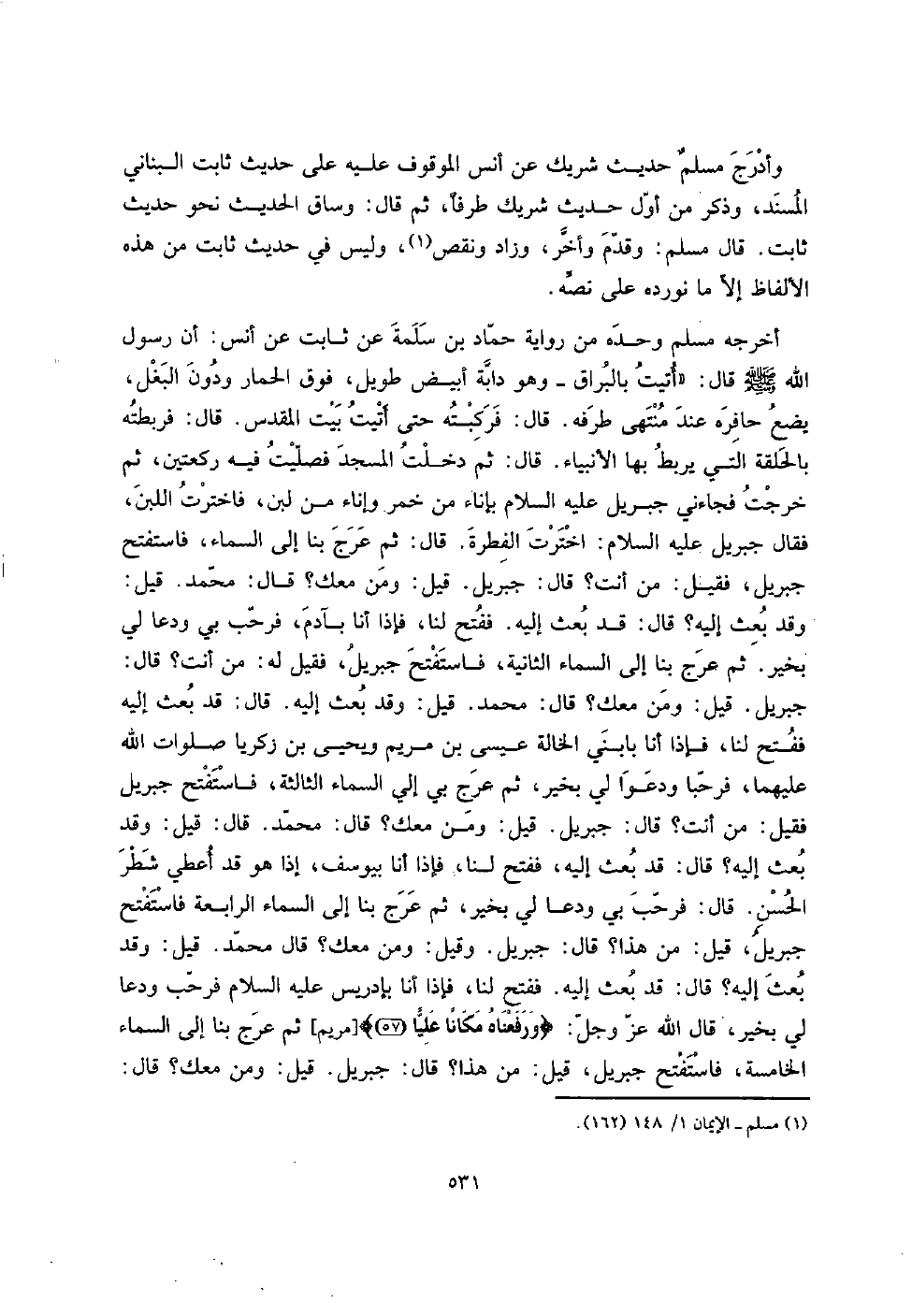 وأدرج مسلمٌ حَدِيث شريك عَن أنس الْمَوْقُوف عَلَيْهِ على حَدِيث ثَابت الْبنانِيّ الْمسند، وَذكر من أول حَدِيث شريك طرفا، ثمَّ قَالَ: وسَاق الحَدِيث نَحْو حَدِيث ثَابت. قَالَ مُسلم: وَقدم وَأخر، وَزَاد وَنقص، وَلَيْسَ فِي حَدِيث ثَابت من هَذِه الْأَلْفَاظ إِلَّا مَا نورده على نَصه.