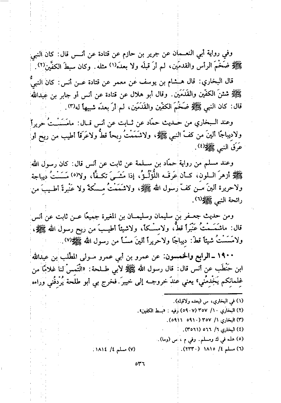 كَانَ رَسُول الله صلى الله عَلَيْهِ وَسلم أَزْهَر اللَّوْن، كَأَن عرقه اللُّؤْلُؤ، إِذا مَشى تكفأ، وَلَا مسست ديباجة وَلَا حريرة أَلين من كف رَسُول الله صلى الله عَلَيْهِ وَسلم، وَلَا شممت مسكةً وَلَا عنبرةً أطيب من رَائِحَة النَّبِي صلى الله عَلَيْهِ وَسلم.
