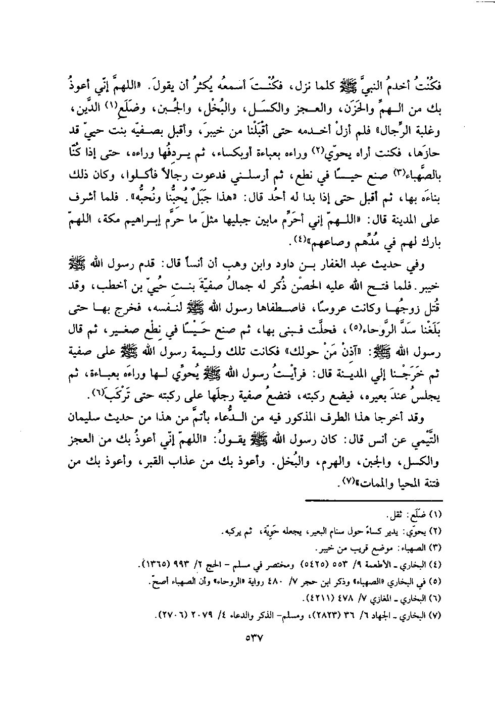" اللَّهُمَّ إِنِّي أعوذ بك من الْهم والحزن، وَالْعجز والكسل، وَالْبخل، والجبن، وضلع الدّين، وَغَلَبَة الرِّجَال " فَلم أزل أخدمه حَتَّى أَقبلنَا من خَيْبَر، وَأَقْبل بصفيه بنت حييّ قد حازها، فَكنت أرَاهُ يحوي وَرَاءه بعباءة أَو بكساء، ثمَّ يردفها وَرَاءه، حَتَّى إِذا كُنَّا بالصهباء صنع حَيْسًا فِي نطع، ثمَّ أَرْسلنِي فدعوت رجَالًا فَأَكَلُوا، وَكَانَ ذَلِك بناءه بهَا، ثمَّ أقبل حَتَّى إِذا بدا لَهُ أحد قَالَ: " هَذَا جبلٌ يحبنا ونحبه ". فَلَمَّا أشرف على الْمَدِينَة قَالَ: " اللَّهُمَّ إِنِّي أحرم مَا بَين جبليها مثل مَا حرم إِبْرَاهِيم مَكَّة، اللَّهُمَّ بَارك لَهُم فِي مدهم وصاعهم ".