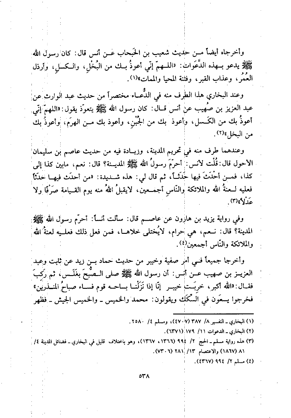 سَأَلت أنسا: أحرم رَسُول الله صلى الله عَلَيْهِ وَسلم الْمَدِينَة؟ قَالَ: نعم، هِيَ حرَام، لَا يخْتَلى خَلاهَا، فَمن فعل ذَلِك فَعَلَيهِ لعنة الله وَالْمَلَائِكَة وَالنَّاس أَجْمَعِينَ.