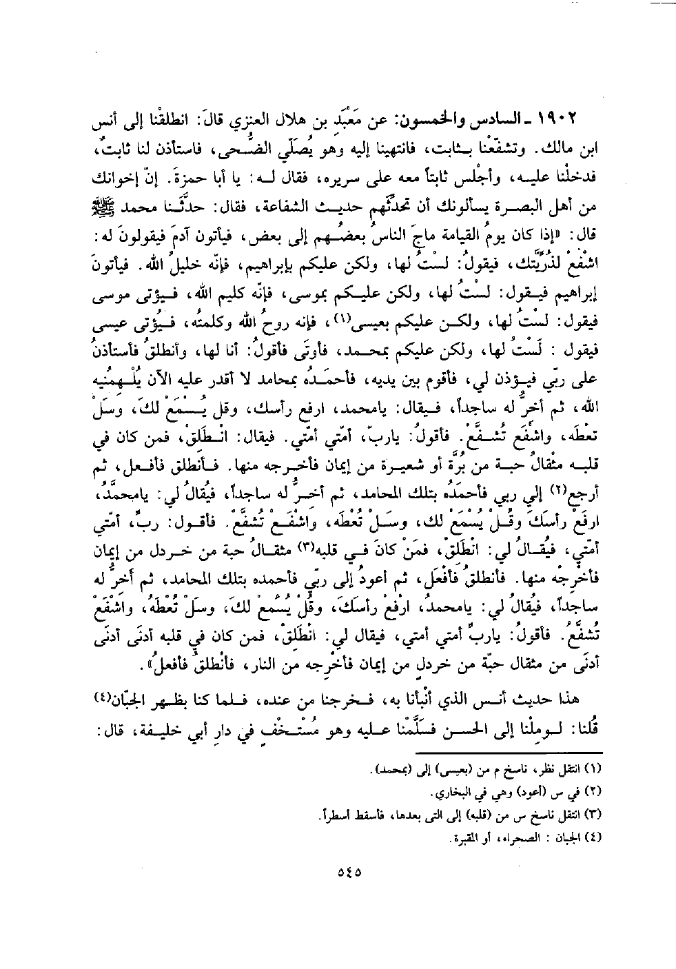 1902 - السَّادِس وَالْخَمْسُونَ: عَن معبد بن هِلَال الْعَنزي قَالَ: انطلقنا إِلَى أنس ابْن مَالك. وتشفعنا بِثَابِت، فَانْتَهَيْنَا إِلَيْهِ وَهُوَ يُصَلِّي الضُّحَى، فَاسْتَأْذن لنا ثابتٌ، فَدَخَلْنَا عَلَيْهِ، وأجلس ثَابتا مَعَه على سَرِيره، فَقَالَ لَهُ: يَا أَبَا حَمْزَة. إِن إخوانك من أهل الْبَصْرَة يَسْأَلُونَك أَن تحدثهم حَدِيث الشَّفَاعَة، فَقَالَ: حَدثنَا مُحَمَّد صلى الله عَلَيْهِ وَسلم قَالَ: " إِذا كَانَ يَوْم الْقِيَامَة ماج النَّاس بَعضهم إِلَى بعض، فَيَأْتُونَ آدم فَيَقُولُونَ لَهُ: اشفع لذريتك، فَيَقُول: لست لَهَا، وَلَكِن عَلَيْكُم بإبراهيم، فَإِنَّهُ خَلِيل الله. فَيَأْتُونَ إِبْرَاهِيم فَيَقُول: لست لَهَا، وَلَكِن عليكمبموسى، فَإِنَّهُ كليم الله، فَيُؤتى مُوسَى فَيَقُول: لست لَهَا، وَلَكِن عَلَيْكُم بِعِيسَى، فَإِنَّهُ روح الله وكلمته، فَيُؤتى عِيسَى فَيَقُول: لست لَهَا، وَلَكِن عَلَيْكُم بِمُحَمد، فأوتى فَأَقُول: أَنا لَهَا، وأنطلق فَاسْتَأْذن على رَبِّي فَيُؤذن لي، فأقوم بَين يَدَيْهِ، فأحمده بِمَحَامِد لَا أقدر عَلَيْهِ الْآن يلهمنيه الله، ثمَّ أخر لَهُ سَاجِدا، فَيُقَال: يَا مُحَمَّد، ارْفَعْ رَأسك، وَقل يسمع لَك، وسل تعطه، وَاشْفَعْ تشفع. فَأَقُول: يَا رب، أمتِي أمتِي. فَيُقَال: انْطلق، فَمن كَانَ فِي قلبه مِثْقَال حَبَّة من برة أَو شعيرَة من إِيمَان فَأخْرجهُ مِنْهَا. فأنطلق فأفعل، ثمَّ ارْجع إِلَى رَبِّي فأحمده بِتِلْكَ المحامد، ثمَّ أخر لَهُ سَاجِدا، فَيُقَال لي: يَا مُحَمَّد، ارْفَعْ رَأسك وَقل يسمع لَك، وسل تعطه، وَاشْفَعْ تشفع. فَأَقُول: رب، أمتِي أمتِي، فَيُقَال لي: انْطلق، فَمن كَانَ فِي قلبه مِثْقَال حَبَّة من خَرْدَل من إِيمَان فَأخْرجهُ مِنْهَا. فأنطلق فأفعل، ثمَّ أَعُود إِلَى رَبِّي فأحمده بِتِلْكَ المحامد، ثمَّ أخر لَهُ سَاجِدا، فَيُقَال لي: يَا مُحَمَّد، ارْفَعْ رَأسك، وَقل يسمع لَك، وسل تعطه، وَاشْفَعْ تشفع. فَأَقُول: يَا رب أمتِي أمتِي، فَيُقَال لي: انْطلق، فَمن كَانَ فِي قلبه أدنى أدنى أدنى من مِثْقَال حَبَّة من خردلٍ من إِيمَان فَأخْرجهُ من النَّار، فأنطلق فأفعل ".