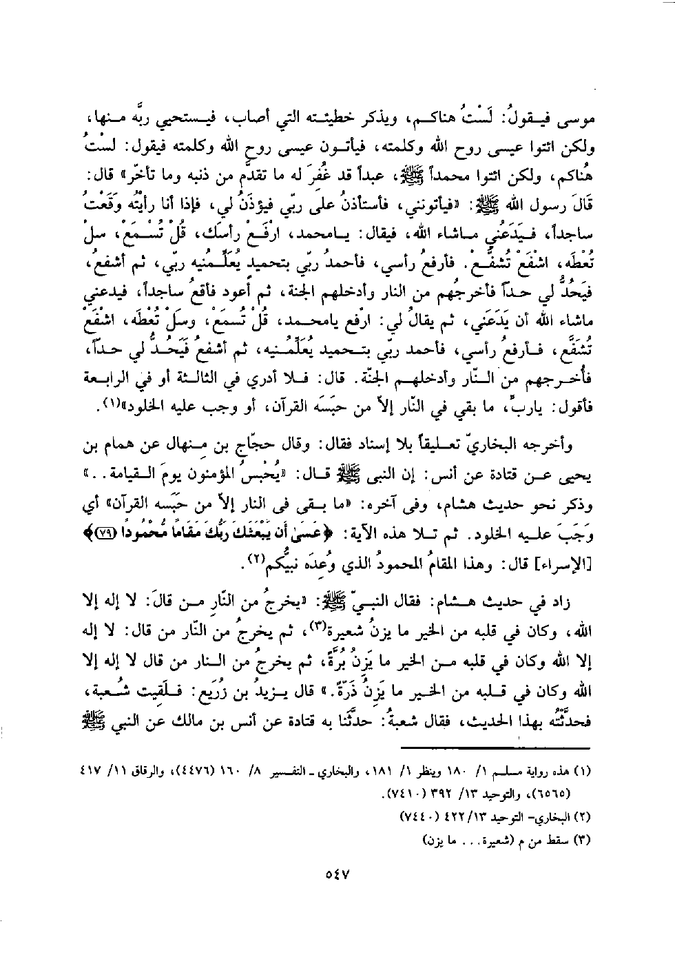مُوسَى فَيَقُول: لست هُنَاكُم، وَيذكر خطيئته الَّتِي أصَاب، فيستحيي ربه مِنْهَا، وَلَكِن ائْتُوا عِيسَى روح الله وكلمته، فَيَأْتُونَ عِيسَى روح الله وكلمته فَيَقُول: لست هُنَاكُم، وَلَكِن ائْتُوا مُحَمَّدًا صلى الله عَلَيْهِ وَسلم، عبدا قد غفر لَهُ مَا تقدم من ذَنبه وَمَا تَأَخّر " قَالَ: قَالَ رَسُول الله صلى الله عَلَيْهِ وَسلم: " فيأتونني، فَأَسْتَأْذِن على رَبِّي فَيُؤذن لي، فَإِذا أَنا رَأَيْته وَقعت سَاجِدا، فيدعني مَا شَاءَ الله، فَيُقَال: يَا مُحَمَّد، ارْفَعْ رَأسك، قل تسمع، سل تعطه، اشفع تشفع. فأرفع رَأْسِي، فَأَحْمَد رَبِّي بتحميد يعلمنيه رَبِّي، ثمَّ أشفع، فَيحد لي حدا فَأخْرجهُمْ من النَّار وأدخلهم الْجنَّة، ثمَّ أَعُود فأقع سَاجِدا، فيدعني مَا شَاءَ الله أَن يدعني، ثمَّ يُقَال لي: ارْفَعْ يَا مُحَمَّد، قل تسمع، وسل تعطه، اشفع تشفع، فأرفع رَأْسِي، فَأَحْمَد رَبِّي بتحميد يعلمنيه، ثمَّ أشفع فَيحد لي حدا، فَأخْرجهُمْ من النَّار وأدخلهم الْجنَّة. قَالَ: فَلَا أَدْرِي فِي الثَّالِثَة أَو فِي الرَّابِعَة فَأَقُول: يَا رب، مَا بَقِي فِي النَّار إِلَّا من حَبسه الْقُرْآن أَو وَجب عَلَيْهِ الخلود ".