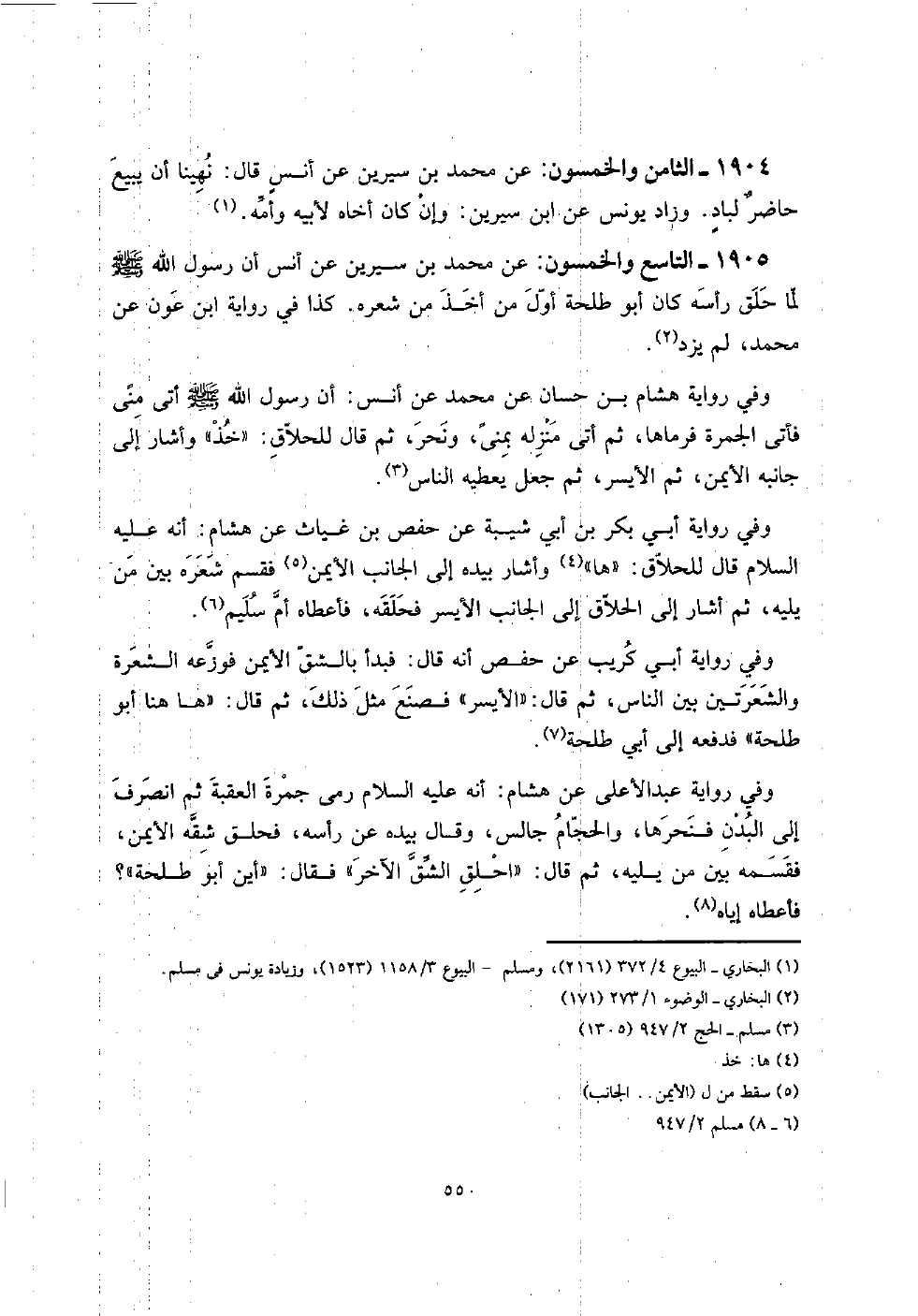 1905 - التَّاسِع وَالْخَمْسُونَ: عَن مُحَمَّد بن سِيرِين عَن أنس أَن رَسُول الله صلى الله عَلَيْهِ وَسلم لما حلق رَأسه كَانَ أَبُو طَلْحَة أول من أَخذ من شعره. كَذَا فِي رِوَايَة ابْن عون عَن مُحَمَّد، لم يزدْ.