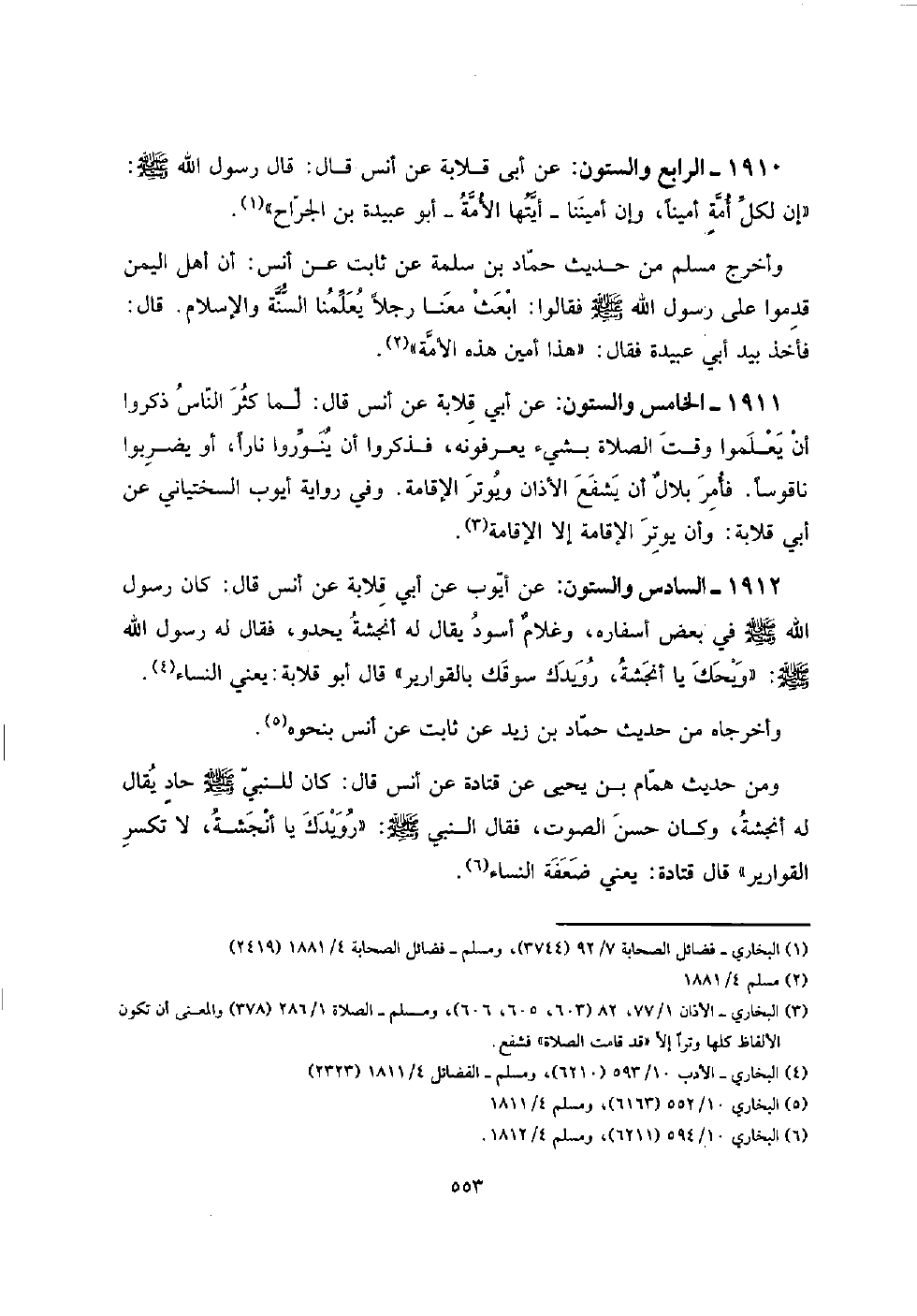 1912 - السَّادِس وَالسِّتُّونَ: عَن أَيُّوب عَن أبي قلَابَة عَن أنس قَالَ: كَانَ رَسُول الله صلى الله عَلَيْهِ وَسلم فِي بعض أَسْفَاره، وغلامٌ أسود يُقَال لَهُ أَنْجَشَة يَحْدُو، فَقَالَ لَهُ رَسُول الله صلى الله عَلَيْهِ وَسلم: " وَيحك يَا أَنْجَشَة، رويدك سوقك بِالْقَوَارِيرِ " قَالَ أَبُو قلَابَة: يَعْنِي النِّسَاء.