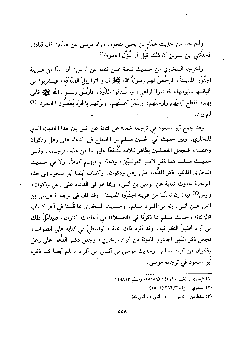 وَقد جمع أَبُو مَسْعُود فِي تَرْجَمَة شُعْبَة عَن قَتَادَة عَن أنس بَين هَذَا الحَدِيث الَّذِي للْبُخَارِيّ، وَبَين حَدِيث أبي الْحُسَيْن مُسلم بن الْحجَّاج فِي الدُّعَاء على رعل وذكوان وعصيه، فَجعل الْفَصْلَيْنِ بِظَاهِر كَلَامه مُتَّفقا عَلَيْهِمَا من هَذِه التَّرْجَمَة. وَلَيْسَ حَدِيث مُسلم هَذَا ذكر لأمر العرنيين، وَالْحكم فيهم أصلا، وَلَا فِي حَدِيث البُخَارِيّ الْمَذْكُور ذكر للدُّعَاء على رعل وذكوان. وأضاف أَيْضا أَبُو مَسْعُود إِلَى هَذِه التَّرْجَمَة حَدِيث شُعْبَة عَن مُوسَى بن أنس، وَإِنَّمَا هُوَ فِي الدُّعَاء على رعل وذكوان، وَلَيْسَ فِيهِ: