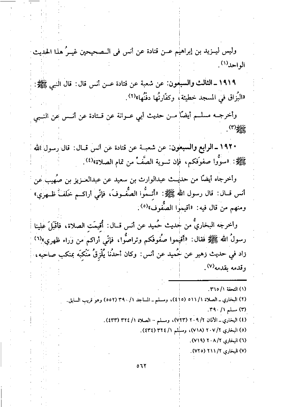 1920 - الرَّابِع وَالسَّبْعُونَ: عَن شُعْبَة عَن قَتَادَة عَن أنس قَالَ: قَالَ رَسُول الله صلى الله عَلَيْهِ وَسلم: " سووا صفوفكم، فَإِن تَسْوِيَة الصَّفّ من تَمام الصَّلَاة ".