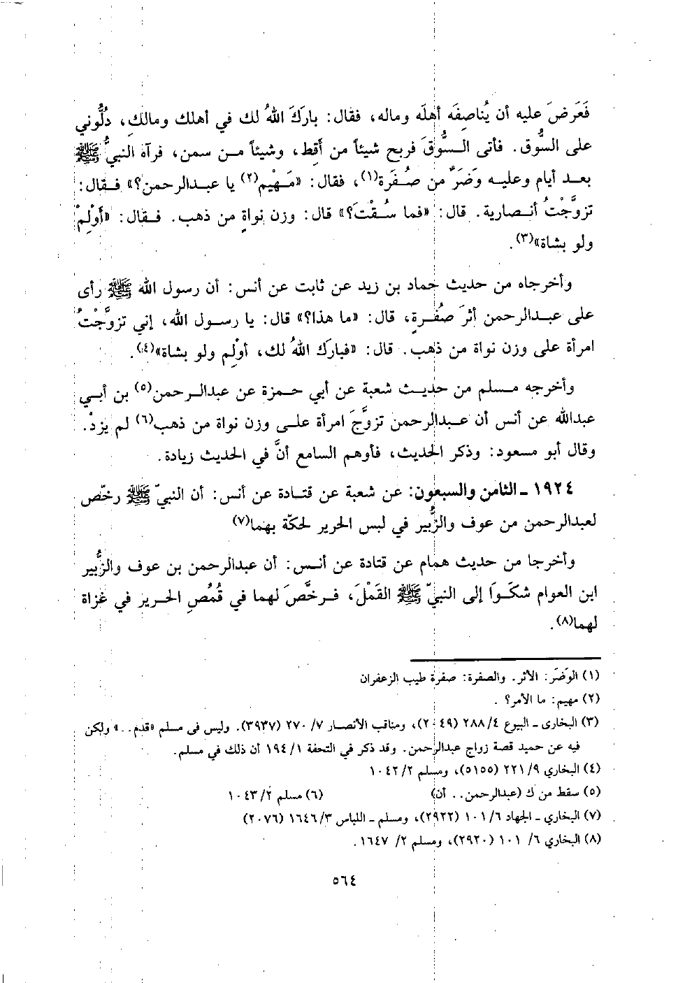 أَن رَسُول الله صلى الله عَلَيْهِ وَسلم رأى على عبد الرَّحْمَن أثر صفرةٍ، قَالَ: " مَا هَذَا؟ " قَالَ: يَا رَسُول الله، إِنِّي تزوجت امْرَأَة على وزن نواة من ذهب. قَالَ: " فَبَارك الله لَك، أولم وَلَو بِشَاة ".