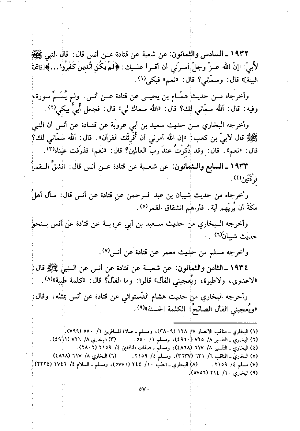 1932 - السَّادِس وَالثَّمَانُونَ: عَن شُعْبَة عَن قَتَادَة عَن أنس قَالَ: قَالَ النَّبِي صلى الله عَلَيْهِ وَسلم لأبي: " إِن الله عز وَجل أَمرنِي أَن أَقرَأ عَلَيْك: {لم يكن الَّذين كفرُوا} [فَاتِحَة الْبَيِّنَة] " قَالَ: وسماني؟ قَالَ: " نعم " فَبكى.