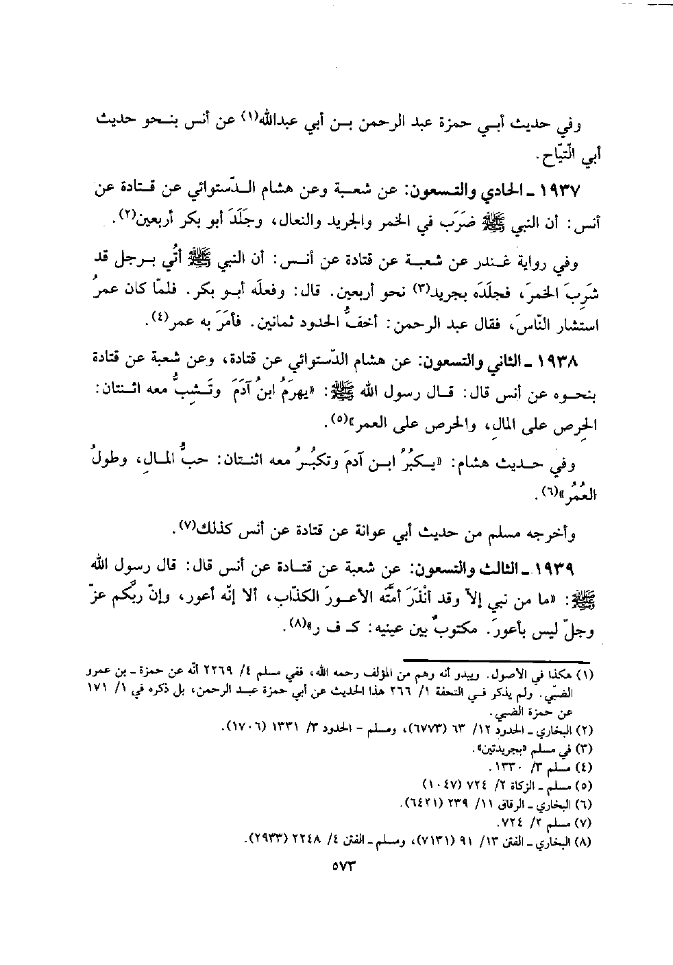 1937 - الْحَادِي وَالتِّسْعُونَ: عَن شُعْبَة وَعَن هِشَام الدستوَائي عَن قَتَادَة عَن أنس: أَن النَّبِي صلى الله عَلَيْهِ وَسلم ضرب فِي الْخمر والجريد وَالنعال، وَجلد أَبُو بكر أَرْبَعِينَ.