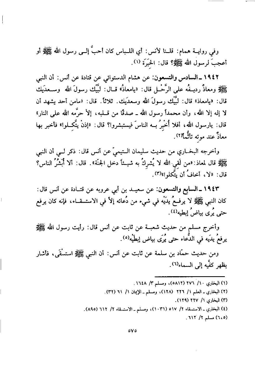 1942 - السَّادِس وَالتِّسْعُونَ: عَن هِشَام الدستوَائي عَن قَتَادَة عَن أنس: أَن النَّبِي صلى الله عَلَيْهِ وَسلم ومعاذٌ رديفه على الرحل قَالَ: " يَا معَاذ " قَالَ: لبيْك رَسُول الله وَسَعْديك قَالَ: " يَا معَاذ " قَالَ: لبيْك رَسُول الله وَسَعْديك. ثَلَاثًا. قَالَ: " مَا من أحد يشْهد أَن لَا إِلَه إِلَّا الله، وَأَن مُحَمَّدًا رَسُول الله - صدقا من قلبه، إِلَّا حرمه الله على النَّار " قَالَ: يَا رَسُول الله، أَفلا أخبر بِهِ النَّاس فيستبشروا؟ قَالَ: " إِذن يتكلوا " فَأخْبر بهَا معاذٌ عِنْد مَوته تأثماً ".