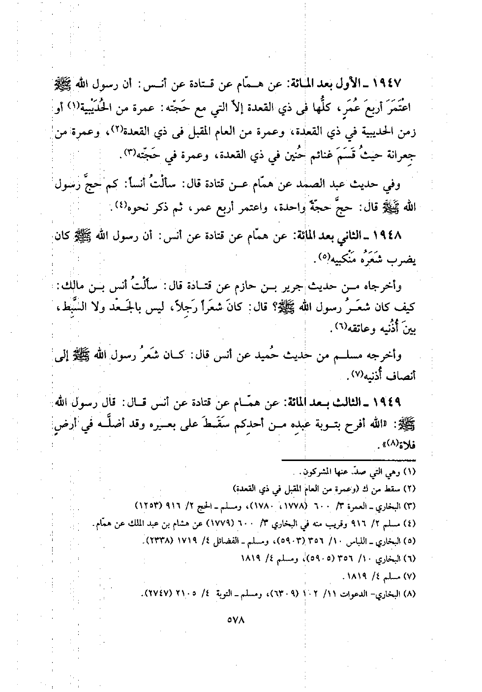1947 - الأول بعد الْمِائَة: عَن همام عَن قَتَادَة عَن أنس: أَن رَسُول الله صلى الله عَلَيْهِ وَسلم اعْتَمر أَربع عمرٍ، كلهَا فِي ذِي الْقعدَة إِلَّا الَّتِي مَعَ حجَّته: عمْرَة من الْحُدَيْبِيَة أَو زمن الْحُدَيْبِيَة فِي ذِي الْقعدَة، وَعمرَة من الْعَام الْمقبل فِي ذِي الْقعدَة، وَعمرَة من جعرانة حَيْثُ قسم غَنَائِم حنين فِي ذِي الْقعدَة، وَعمرَة فِي حجَّته.