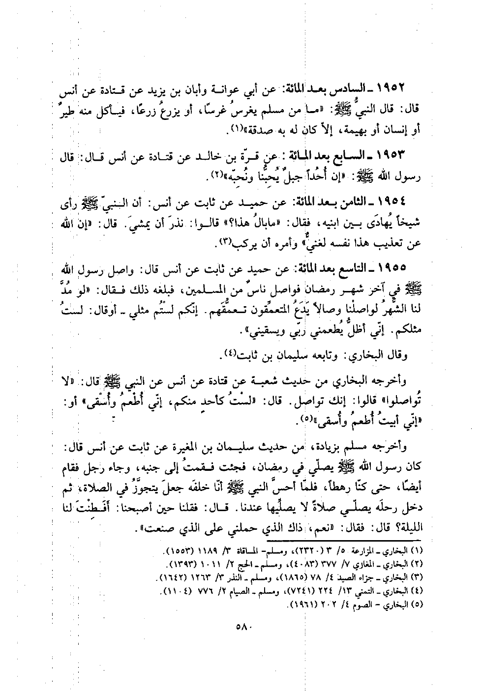1952 - السَّادِس بعد الْمِائَة: عَن أبي عوَانَة وَأَبَان بن يزِيد عَن قَتَادَة عَن أنس قَالَ: قَالَ النَّبِي صلى الله عَلَيْهِ وَسلم: " مَا من مُسلم يغْرس غرساً، أَو يزرع زرعا، فيأكل مِنْهُ طيرٌ أَو إِنْسَان أَو بَهِيمَة، إِلَّا كَانَ لَهُ بِهِ صَدَقَة ".