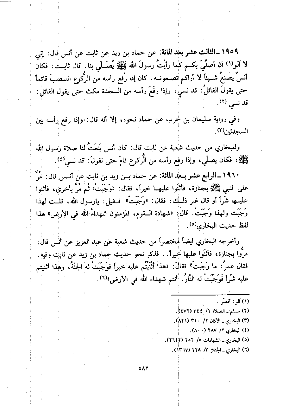 1959 - الثَّالِث عشر بعد الْمِائَة: عَن حَمَّاد بن زيد عَن ثَابت عَن أنس قَالَ: إِنِّي لَا آلو أَن أُصَلِّي بكم كَمَا رَأَيْت رَسُول الله صلى الله عَلَيْهِ وَسلم يُصَلِّي بِنَا. قَالَ ثَابت: فَكَانَ أنسٌ يصنع شَيْئا لَا أَرَاكُم تصنعونه. كَانَ إِذا رفع رَأسه من الرُّكُوع انتصب قَائِما حَتَّى يَقُول الْقَائِل: قد نسي، وَإِذا رفع رَأسه من السَّجْدَة مكث حَتَّى يَقُول الْقَائِل: قد نسي.