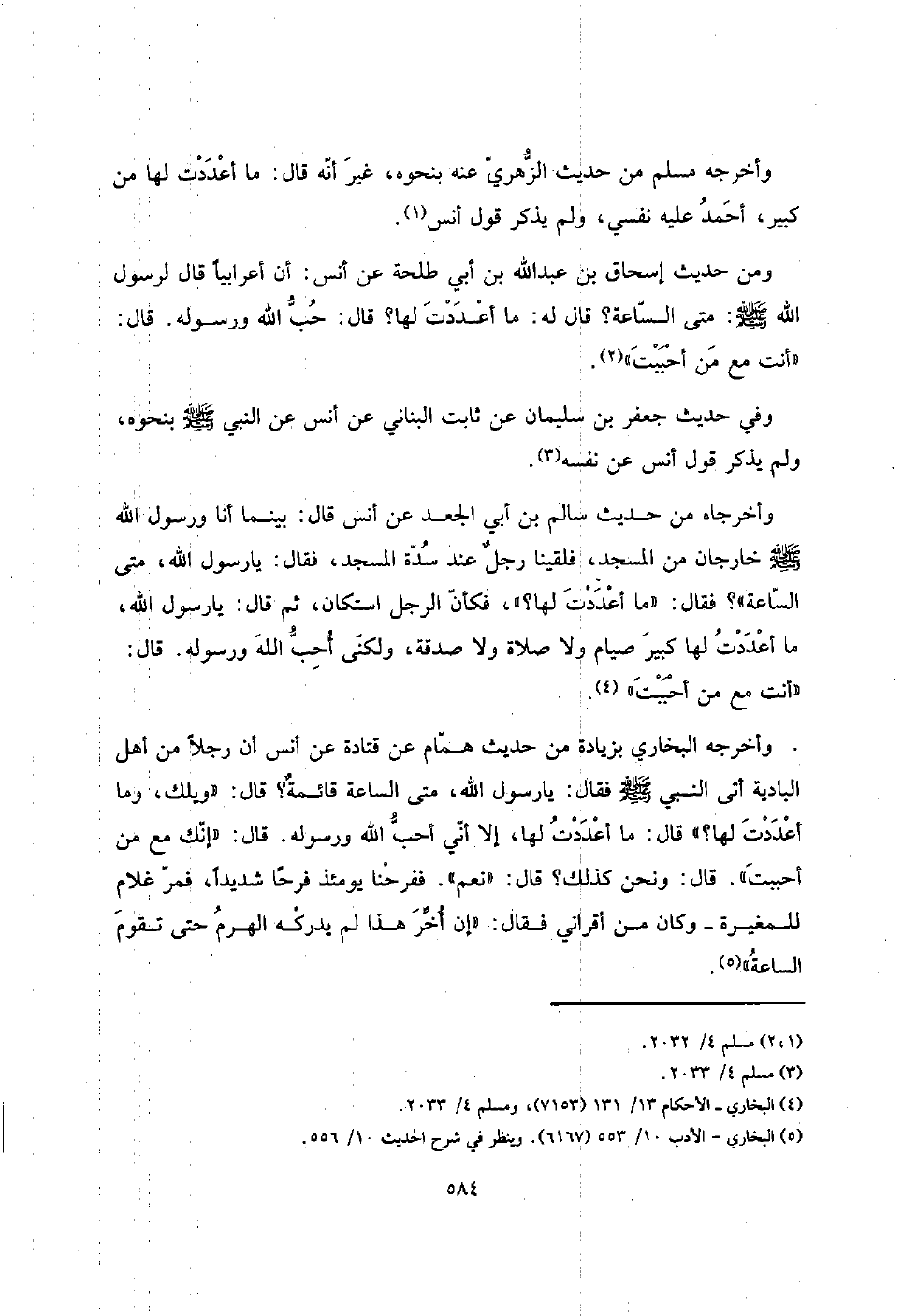 أَن أَعْرَابِيًا قَالَ لرَسُول الله صلى الله عَلَيْهِ وَسلم: مَتى السَّاعَة؟ قَالَ لَهُ: مَا أَعدَدْت لَهَا؟ قَالَ: حب الله وَرَسُوله. قَالَ: " أَنْت مَعَ من أَحْبَبْت ".
