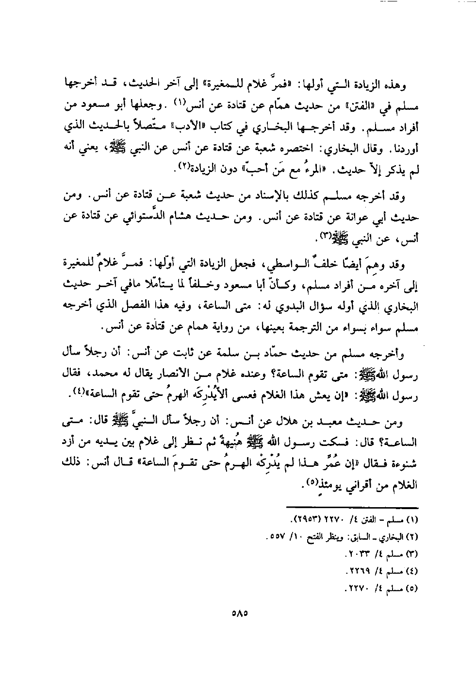 فَمر غُلَام للْمُغِيرَة " إِلَى آخر الحَدِيث، قد أخرجهَا مُسلم فِي " الْفِتَن " من حَدِيث همام عَن قَتَادَة عَن أنس. وَجعلهَا أَبُو مَسْعُود من أَفْرَاد مُسلم. وَقد أخرجهَا البُخَارِيّ فِي كتاب " الْأَدَب " مُتَّصِلا بِالْحَدِيثِ الَّذِي أوردنا. وَقَالَ البُخَارِيّ: اخْتَصَرَهُ شُعْبَة عَن قَتَادَة عَن أنس عَن النَّبِي صلى الله عَلَيْهِ وَسلم، يَعْنِي أَنه لم يذكر إِلَّا حَدِيث. " الْمَرْء مَعَ من أحب " دون الزِّيَادَة.