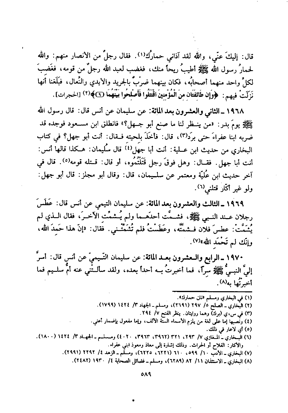 1968 - الثَّانِي وَالْعشْرُونَ بعد الْمِائَة: عَن سُلَيْمَان عَن أنس قَالَ: قَالَ رَسُول الله صلى الله عَلَيْهِ وَسلم يَوْم بدر: " من ينظر لنا مَا صنع أَبُو جهل؟ " فَانْطَلق ابْن مَسْعُود فَوَجَدَهُ قد ضربه ابْنا عفراء حَتَّى برد، قَالَ: فَأخذ بلحيته فَقَالَ: أَنْت أَبُو جهل؟ فِي كتاب البُخَارِيّ من حَدِيث ابْن علية: أَنْت أَبَا جهل قَالَ سُلَيْمَان: هَكَذَا قَالَهَا أنس: أَنْت أَبَا جهل. فَقَالَ: وَهل فَوق رجل قَتَلْتُمُوهُ، أَو قَالَ: قَتله قومه. قَالَ فِي آخر حَدِيث ابْن علية ومعتمر عَن سُلَيْمَان، قَالَ: وَقَالَ أَبُو مجلز: قَالَ أَبُو جهل: وَلَو غير أكار قتلني.