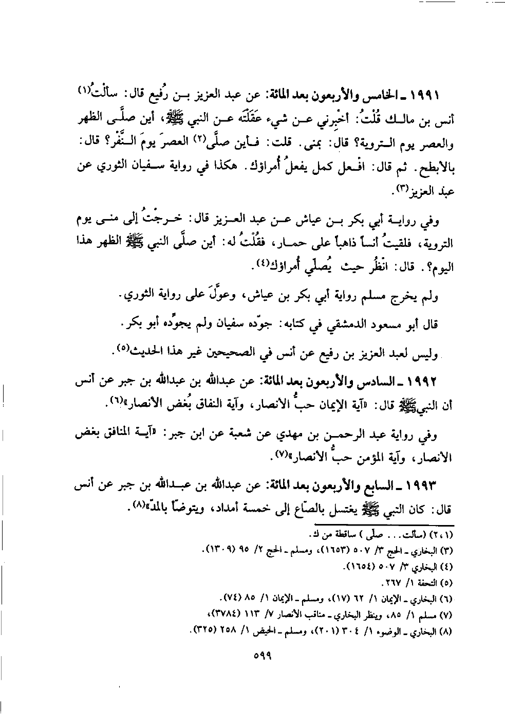 1991 - الْخَامِس وَالْأَرْبَعُونَ بعد الْمِائَة: عَن عبد الْعَزِيز بن رفيع قَالَ: سَأَلت أنس بن مَالك قلت: أَخْبرنِي عَن شَيْء عقلته عَن النَّبِي صلى الله عَلَيْهِ وَسلم، أَيْن صلى الظّهْر وَالْعصر يَوْم التَّرويَة؟ قَالَ: بمنى. قلت: فَأَيْنَ صلى الْعَصْر يَوْم النَّفر؟ قَالَ: بِالْأَبْطح. ثمَّ قَالَ: افْعَل كمل يفعل أمراؤك. هَكَذَا فِي رِوَايَة سُفْيَان الثَّوْريّ عَن عبد الْعَزِيز.