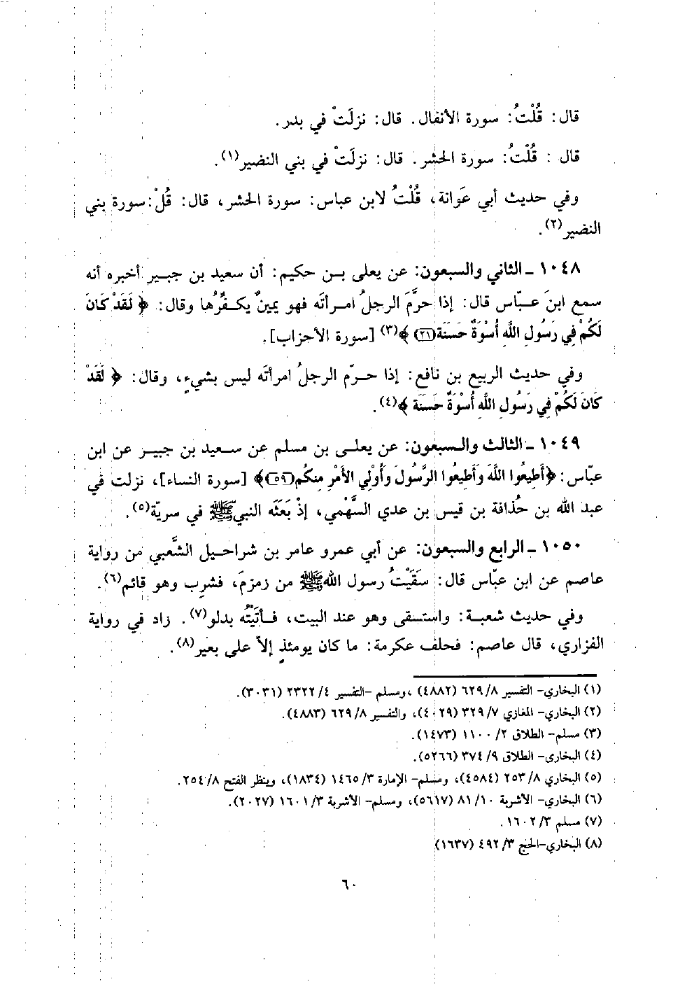 1049 - الثَّالِث وَالسَّبْعُونَ: عَن يعلى بن مُسلم عَن سعيد بن جُبَير عَن ابْن عَبَّاس: {أطِيعُوا الله وَأَطيعُوا الرَّسُول وأولي الْأَمر مِنْكُم} [سُورَة النِّسَاء] ، نزلت فِي عبد الله بن حذافة بن قيس بن عدي السَّهْمِي، إِذْ بَعثه النَّبِي صلى الله عَلَيْهِ وَسلم فِي سَرِيَّة.