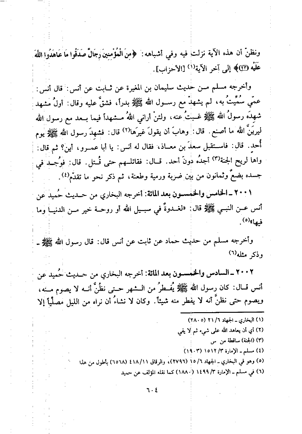 2001 - الْخَامِس وَالْخَمْسُونَ بعد الْمِائَة: أخرجه البُخَارِيّ من حَدِيث حميد عَن أنس عَن النَّبِي صلى الله عَلَيْهِ وَسلم قَالَ: " لغدوةٌ فِي سَبِيل الله أَو رَوْحَة خير من الدُّنْيَا وَمَا فِيهَا ".