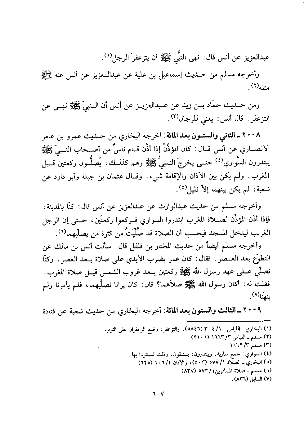 2008 - الثَّانِي وَالسِّتُّونَ بعد الْمِائَة: أخرجه البُخَارِيّ من حَدِيث عَمْرو بن عَامر الْأنْصَارِيّ عَن أنس قَالَ: كَانَ الْمُؤَذّن إِذا أذن قَامَ ناسٌ من أَصْحَاب النَّبِي صلى الله عَلَيْهِ وَسلم يبتدرون السَّوَارِي حَتَّى يخرج النَّبِي صلى الله عَلَيْهِ وَسلم وهم كَذَلِك، يصلونَ رَكْعَتَيْنِ قبل الْمغرب. وَلم يكن بَين الْأَذَان وَالْإِقَامَة شَيْء. وَقَالَ عُثْمَان بن جبلة وَأَبُو دَاوُد عَن شُعْبَة: لم يكن بَينهمَا إِلَّا قَلِيل.