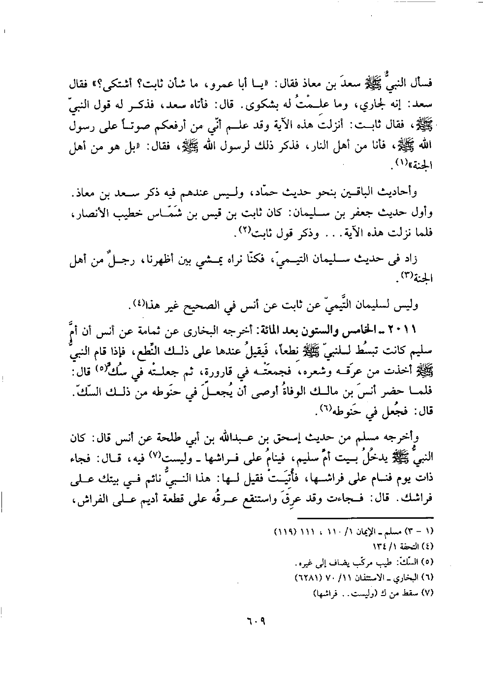 2011 - الْخَامِس وَالسِّتُّونَ بعد الْمِائَة: أخرجه البُخَارِيّ عَن ثُمَامَة عَن أنس أَن أم سليم كَانَت تبسط للنَّبِي صلى الله عَلَيْهِ وَسلم نطعاً، فيقيل عِنْدهَا على ذَلِك النطع، فَإِذا قَامَ النَّبِي صلى الله عَلَيْهِ وَسلم أخذت من عرقه وشعره، فجمعته فِي قَارُورَة، ثمَّ جعلته فِي سك قَالَ: فَلَمَّا حضر أنس بن مَالك الْوَفَاة أوصى أَن يَجْعَل فِي حنوطه من ذَلِك السك.