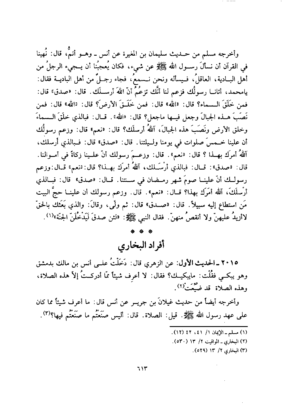 نهينَا فِي الْقُرْآن أَن نسْأَل رَسُول الله صلى الله عَلَيْهِ وَسلم عَن شَيْء، فَكَانَ يعجبنا أَن يَجِيء الرجل من أهل الْبَادِيَة، الْعَاقِل، فيسأله وَنحن نسْمع، فجَاء رجلٌ من أهل الْبَادِيَة فَقَالَ: يَا مُحَمَّد، أَتَانَا رَسُولك فَزعم لنا أَنَّك تزْعم أَن الله أرسلك. قَالَ: " صدق " قَالَ: فَمن خلق السَّمَاء؟ قَالَ: " الله " قَالَ: فَمن خلق الأَرْض؟ قَالَ: " الله " قَالَ: فَمن نصب هَذِه الْجبَال وَجعل فِيهَا مَا جعل؟ قَالَ: " الله ". قَالَ: فبالذي خلق السَّمَاء وَخلق الأَرْض وَنصب هَذِه الْجبَال، آللَّهُ أرسلك؟ قَالَ: " نعم " قَالَ: وَزعم رَسُولك أَن علينا خمس صلوَات فِي يَوْمنَا وليلتنا. قَالَ: " صدق " قَالَ: فبالذي أرسلك، آللَّهُ أَمرك بِهَذَا؟ قَالَ: " نعم ". قَالَ: وَزعم رَسُولك أَن علينا زَكَاة فِي أَمْوَالنَا.