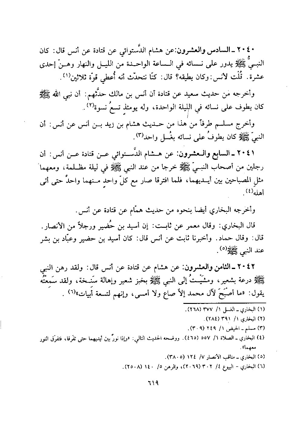 2040 - السَّادِس وَالْعشْرُونَ: عَن هِشَام الدستوَائي عَن قَتَادَة عَن أنس قَالَ: كَانَ النَّبِي صلى الله عَلَيْهِ وَسلم يَدُور على نِسَائِهِ فِي السَّاعَة الْوَاحِدَة من اللَّيْل وَالنَّهَار وَهن إِحْدَى عشرَة. قلت لأنس: وَكَانَ يطيقه؟ قَالَ: كُنَّا نتحدث أَنه أعطي قُوَّة ثَلَاثِينَ.