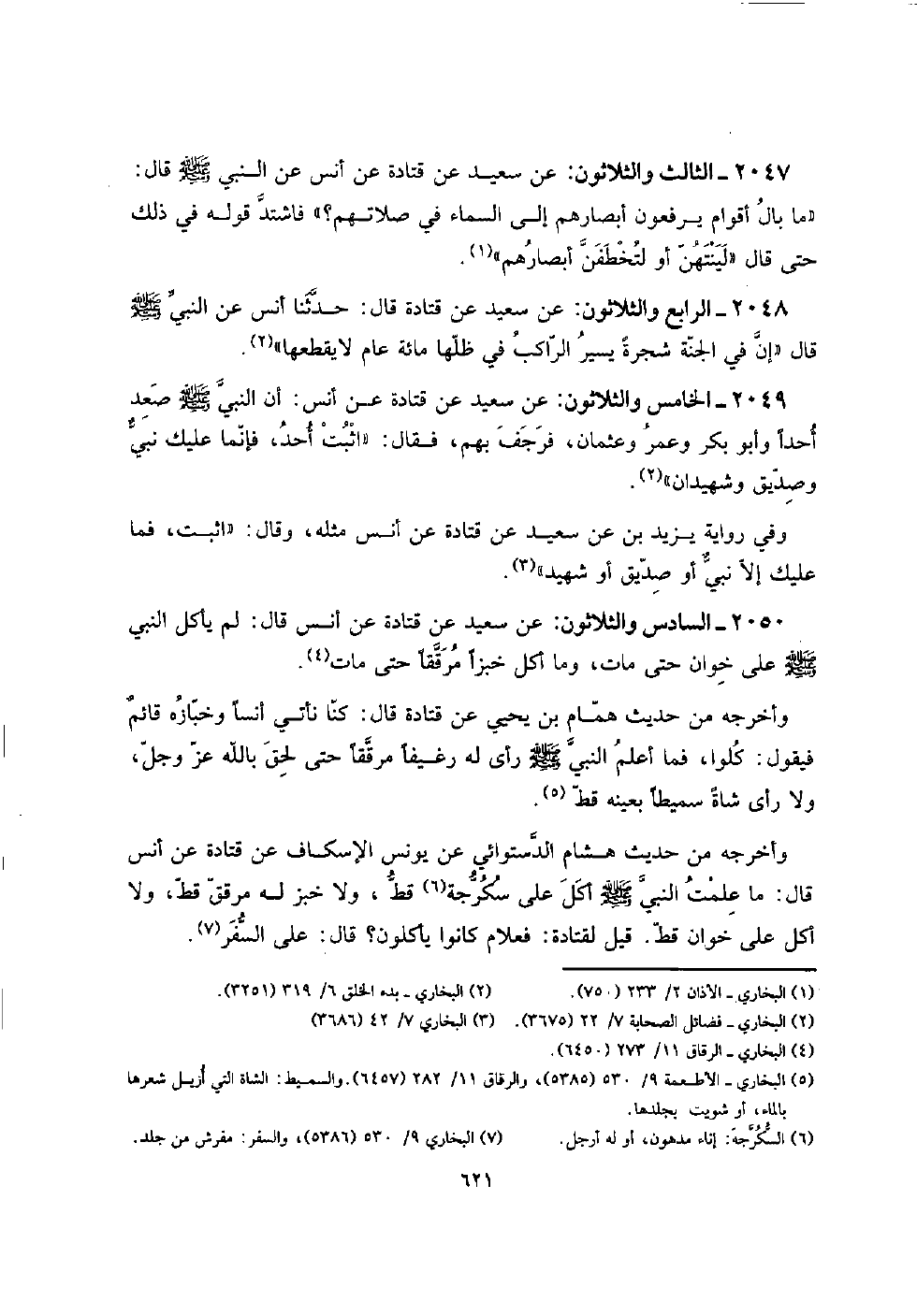 2050 - السَّادِس وَالثَّلَاثُونَ: عَن سعيد عَن قَتَادَة عَن أنس قَالَ: لم يَأْكُل النَّبِي صلى الله عَلَيْهِ وَسلم على خوان حَتَّى مَاتَ، وَمَا أكل خبْزًا مرققاً حَتَّى مَاتَ.