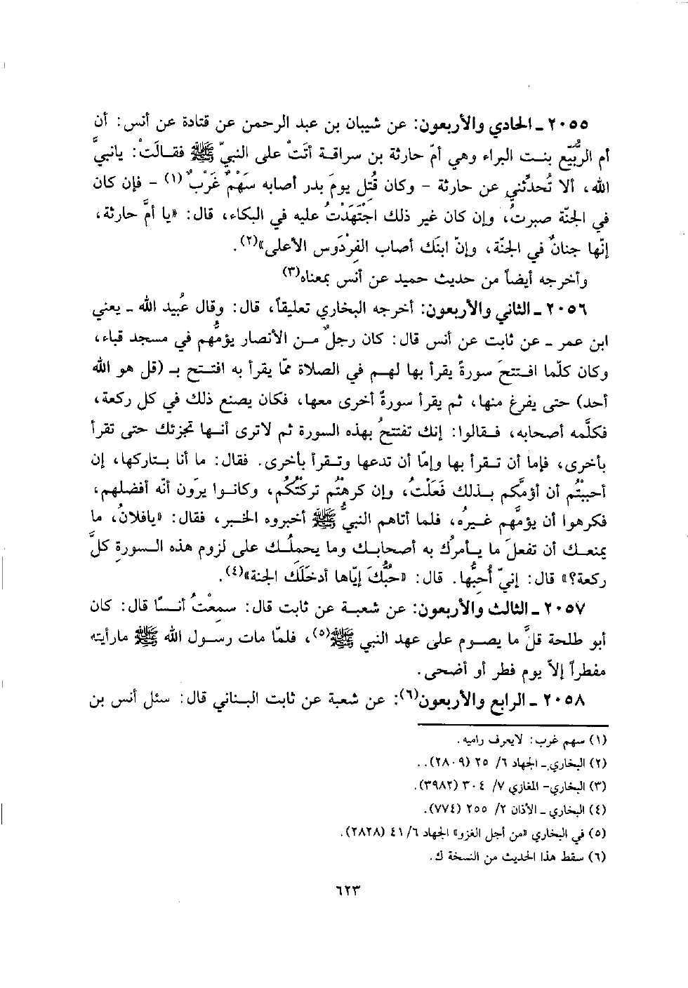 2055 - الْحَادِي وَالْأَرْبَعُونَ: عَن شَيبَان بن عبد الرَّحْمَن عَن قَتَادَة عَن أنس: أَن أم الرّبيع بنت الْبَراء وَهِي أم حَارِثَة بن سراقَة أَتَت على النَّبِي صلى الله عَلَيْهِ وَسلم فَقَالَت: يَا نَبِي الله، أَلا تُحَدِّثنِي عَن حَارِثَة - وَكَانَ قتل يَوْم بدر أَصَابَهُ سهمٌ غربٌ - فَإِن كَانَ فِي الْجنَّة صبرت، وَإِن غير ذَلِك اجتهدت عَلَيْهِ فِي الْبكاء، قَالَ: " يَا أم حَارِثَة، إِنَّهَا جنانٌ فِي الْجنَّة، وَإِن ابْنك أصَاب الفردوس الْأَعْلَى ".