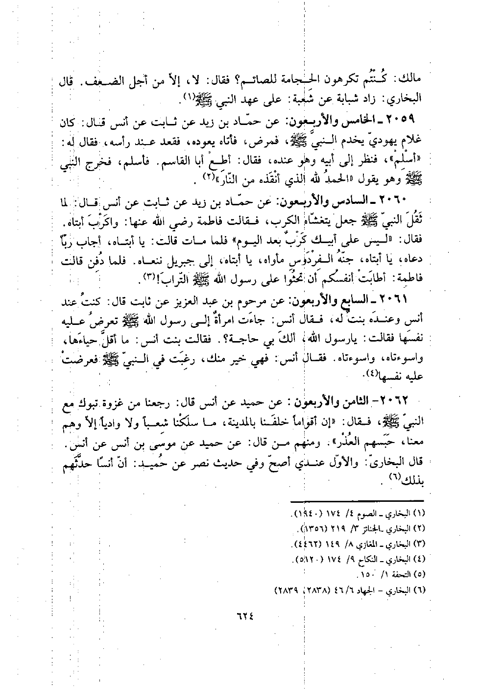2059 - الْخَامِس وَالْأَرْبَعُونَ: عَن حَمَّاد بن زيد عَن ثَابت عَن أنس قَالَ: كَانَ غُلَام يَهُودِيّ يخْدم النَّبِي صلى الله عَلَيْهِ وَسلم، فَمَرض، فَأَتَاهُ يعودهُ، فَقعدَ عِنْد رَأسه، فَقَالَ لَهُ: " أسلم "، فَنظر إِلَى أَبِيه وَهُوَ عِنْده، فَقَالَ: أطع أَبَا الْقَاسِم. فَأسلم، فَخرج النَّبِي صلى الله عَلَيْهِ وَسلم وَهُوَ يَقُول " الْحَمد لله الَّذِي أنقذه من النَّار ".
