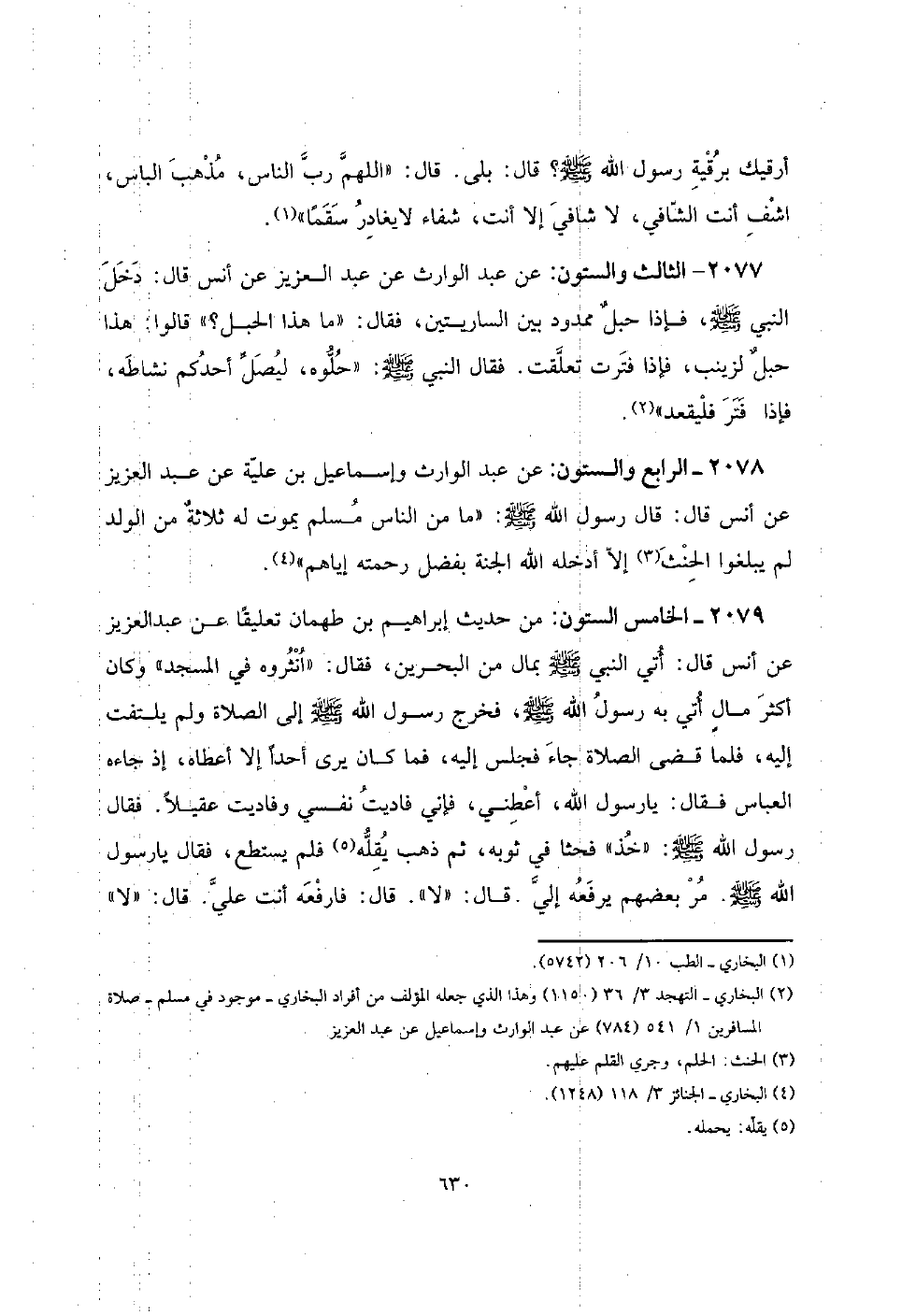 2079 - الْخَامِس وَالسِّتُّونَ: من حَدِيث إِبْرَاهِيم بن طهْمَان تَعْلِيقا عَن عبد الْعَزِيز عَن أنس قَالَ: أُتِي النَّبِي صلى الله عَلَيْهِ وَسلم بِمَال من الْبَحْرين، فَقَالَ: " انثروه فِي الْمَسْجِد " وَكَانَ أَكثر مالٍ أُتِي بِهِ رَسُول الله صلى الله عَلَيْهِ وَسلم، فَخرج رَسُول الله صلى الله عَلَيْهِ وَسلم إِلَى الصَّلَاة وَلم يلْتَفت إِلَيْهِ، فَلَمَّا قضى الصَّلَاة جَاءَ فَجَلَسَ إِلَيْهِ، فَمَا كَانَ يرى أحدا إِلَّا أعطَاهُ، إِذْ جَاءَهُ الْعَبَّاس فَقَالَ: يَا رَسُول الله، أَعْطِنِي، فَإِنِّي فاديت نَفسِي وفاديت عقيلاً. فَقَالَ رَسُول الله صلى الله عَلَيْهِ وَسلم: " خُذ " فَحَثَا فِي ثَوْبه، ثمَّ ذهب يقلهُ فَلم يسْتَطع، فَقَالَ يَا رَسُول الله صلى الله عَلَيْهِ وَسلم. مر بَعضهم يرفعهُ إِلَيّ. قَالَ: " لَا ". قَالَ: فارفعه أَنْت عَليّ. قَالَ: " لَا "
