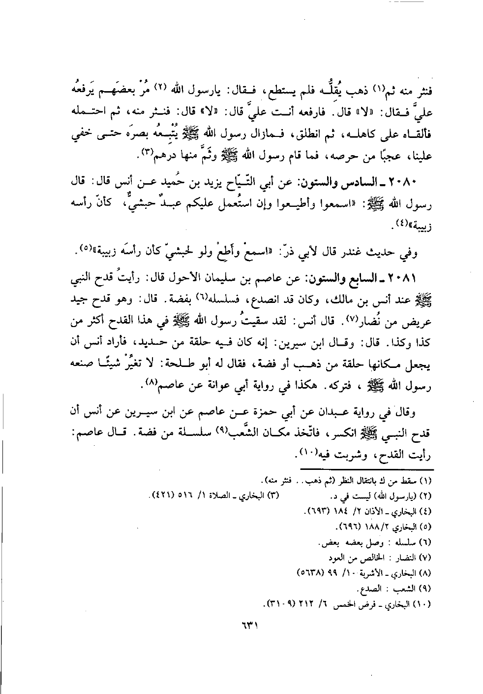 2081 - السَّابِع وَالسِّتُّونَ: عَن عَاصِم بن سُلَيْمَان الْأَحول قَالَ: رَأَيْت قدح النَّبِي صلى الله عَلَيْهِ وَسلم عِنْد أنس بن مَالك، وَكَانَ قد انصدع، فسلسله بِفِضَّة. قَالَ: وَهُوَ قدح جيد عريض من نضار. قَالَ أنس: لقد سقيت رَسُول الله صلى الله عَلَيْهِ وَسلم فِي هَذَا الْقدح أَكثر من كَذَا وَكَذَا. قَالَ: وَقَالَ ابْن سِيرِين: إِنَّه كَانَ فِيهِ حَلقَة من حَدِيد، فَأَرَادَ أنس أَن يَجْعَل مَكَانهَا حَلقَة من ذهب أَو فضَّة، فَقَالَ لَهُ أَبُو طَلْحَة: لَا تغير شَيْئا صنعه رَسُول الله صلى الله عَلَيْهِ وَسلم، فَتَركه. هَكَذَا فِي رِوَايَة أبي عوَانَة عَن عَاصِم.