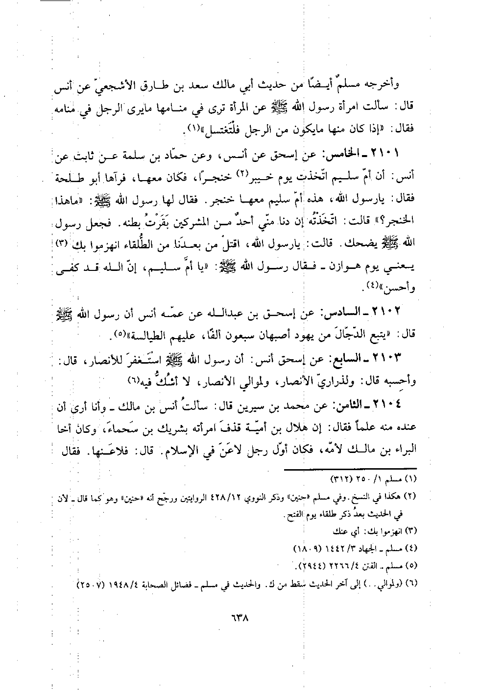 2101 - الْخَامِس: عَن إِسْحَق عَن أنس، وَعَن حَمَّاد بن سَلمَة عَن ثَابت عَن أنس: أَن أم سليم اتَّخذت يَوْم خَيْبَر خنجراً، فَكَانَ مَعهَا، فرآها أَبُو طَلْحَة فَقَالَ: يَا رَسُول الله، هَذِه أم سليم مَعهَا خنجر. فَقَالَ لَهَا رَسُول الله صلى الله عَلَيْهِ وَسلم: " مَا هَذَا الخنجر؟ " قَالَت: اتخذته إِن دنا مني أحدٌ من الْمُشْركين بقرت بَطْنه. فَجعل رَسُول الله صلى الله عَلَيْهِ وَسلم يضْحك. قَالَت: يَا رَسُول الله، اقْتُل من بَعدنَا من الطُّلَقَاء انْهَزمُوا بك يَعْنِي يَوْم هوَازن - فَقَالَ رَسُول الله صلى الله عَلَيْهِ وَسلم: " يَا أم سليم، إِن الله قد كفى وَأحسن ".