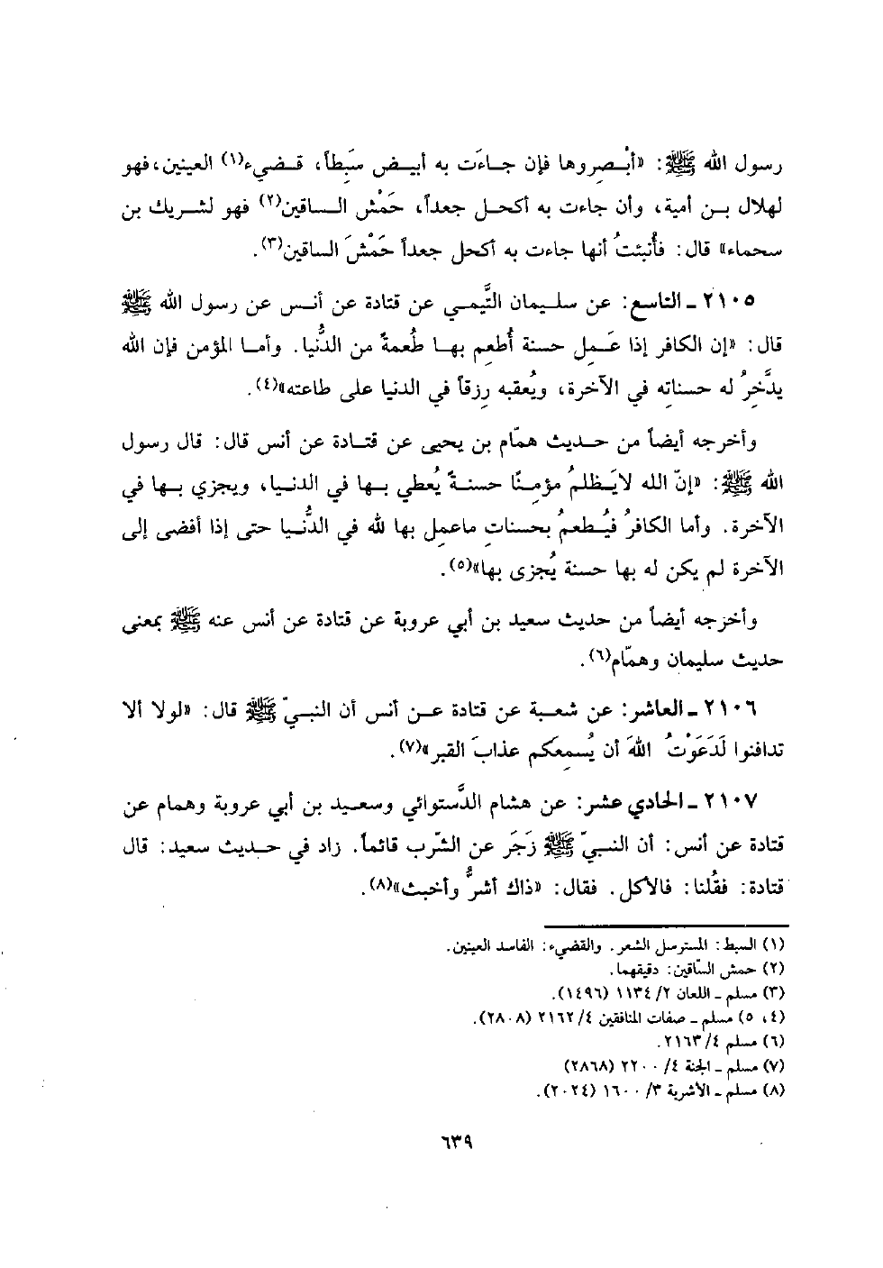 2105 - التَّاسِع: عَن سُلَيْمَان التَّيْمِيّ عَن قَتَادَة عَن أنس عَن رَسُول الله صلى الله عَلَيْهِ وَسلم قَالَ: " إِن الْكَافِر إِذا عمل حَسَنَة أطْعم بهَا طعمةً من الدُّنْيَا. وَأما الْمُؤمن فَإِن الله يدّخر لَهُ حَسَنَاته فِي الْآخِرَة، ويعقبه رزقا فِي الدُّنْيَا على طَاعَته.