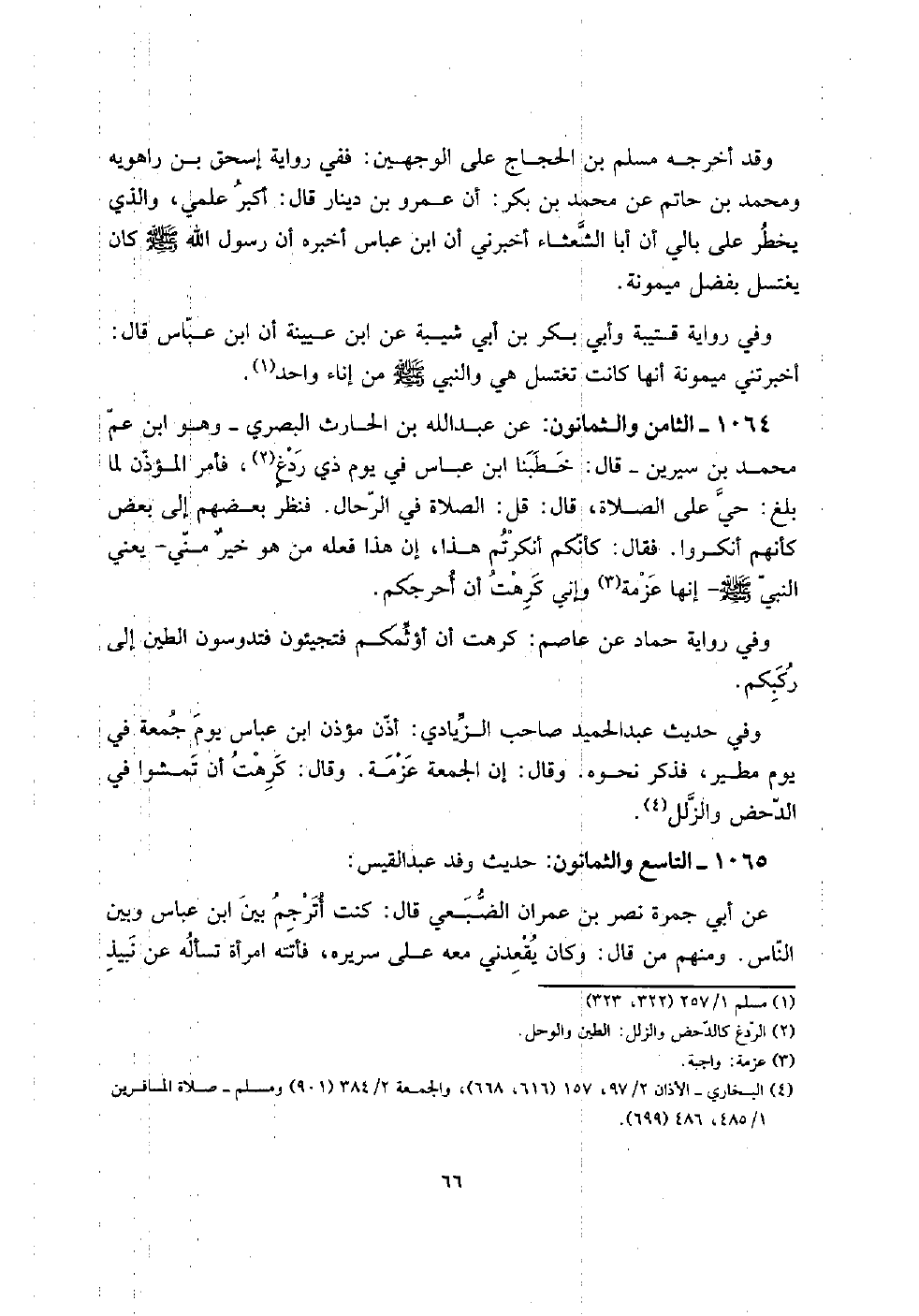 1064 - الثَّامِن وَالثَّمَانُونَ: عَن عبد الله بن الْحَارِث الْبَصْرِيّ - وَهُوَ ابْن عَم مُحَمَّد بن سِيرِين - قَالَ: خَطَبنَا ابْن عَبَّاس فِي يَوْم ذِي ردغٍ، فَأمر الْمُؤَذّن لما بلغ: حَيّ على الصَّلَاة، قَالَ: قل: الصَّلَاة فِي الرّحال. فَنظر بَعضهم إِلَى بعض كَأَنَّهُمْ أَنْكَرُوا. فَقَالَ: كأنكم أنكرتم هَذَا، إِن هَذَا فعله من هُوَ خيرٌ مني - يَعْنِي النَّبِي صلى الله عَلَيْهِ وَسلم - إِنَّهَا عَزمَة وَإِنِّي كرهت أَن أحرجكم.