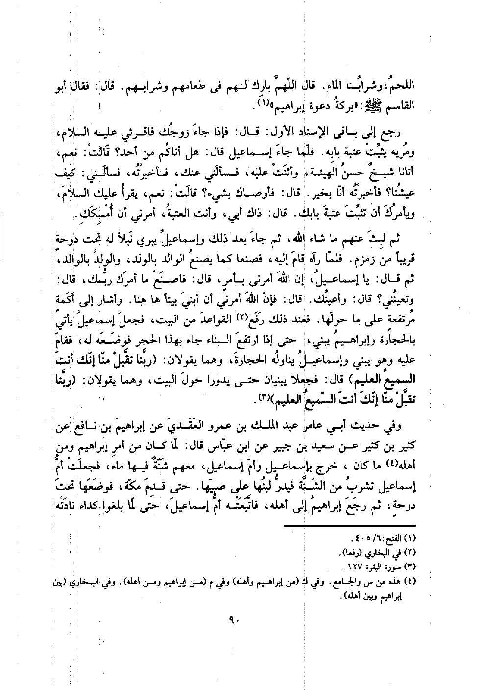 ثمَّ لبث عَنْهُم مَا شَاءَ الله، ثمَّ جَاءَ بعد ذَلِك وَإِسْمَاعِيل يبري نبْلًا لَهُ تَحت دوحةٍ قَرِيبا من زَمْزَم. فَلَمَّا رَآهُ قَامَ إِلَيْهِ، فصنعا كَمَا يصنع الْوَالِد بِالْوَلَدِ، وَالْولد بالوالد، ثمَّ قَالَ: يَا إِسْمَاعِيل، إِن الله أَمرنِي بأمرٍ، قَالَ: فَاصْنَعْ مَا أَمرك رَبك، قَالَ: وتعينني؟ قَالَ: وأعينك. قَالَ: فَإِن الله أَمرنِي أَن أبني بَيْتا هَا هُنَا. وَأَشَارَ إِلَى أكمةٍ مرتفعةٍ على مَا حولهَا. فَعِنْدَ ذَلِك رفع الْقَوَاعِد من الْبَيْت، فَجعل إِسْمَاعِيل يَأْتِي بِالْحِجَارَةِ وَإِبْرَاهِيم يَبْنِي، حَتَّى إِذا ارْتَفع الْبناء جَاءَ بِهَذَا الْحجر فَوَضعه لَهُ، فَقَامَ عَلَيْهِ وَهُوَ يَبْنِي وَإِسْمَاعِيل يناوله الْحِجَارَة، وهما يَقُولَانِ: {رَبنَا تقبل منا إِنَّك أَنْت السَّمِيع الْعَلِيم} قَالَ: فَجعلَا يبنيان حَتَّى يدورا حول الْبَيْت، وهما يَقُولَانِ: {رَبنَا تقبل منا إِنَّك أَنْت السَّمِيع الْعَلِيم} .