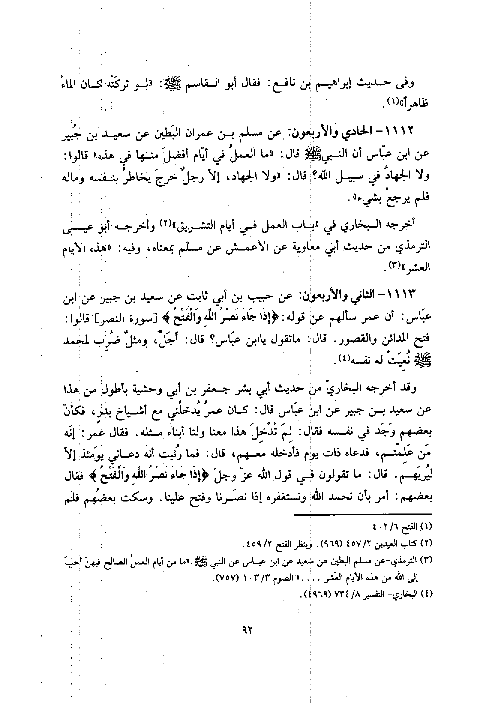 1112 - الْحَادِي وَالْأَرْبَعُونَ: عَن مُسلم بن عمرَان البطين عَن سعيد بن جُبَير عَن ابْن عَبَّاس أَن النَّبِي صلى الله عَلَيْهِ وَسلم قَالَ: " مَا الْعَمَل فِي أَيَّام أفضل مِنْهَا فِي هَذِه " قَالُوا: وَلَا الْجِهَاد فِي سَبِيل الله؟ قَالَ: " وَلَا الْجِهَاد، إِلَّا رجلٌ خرج يخاطر بِنَفسِهِ وَمَاله فَلم يرجع بِشَيْء ".