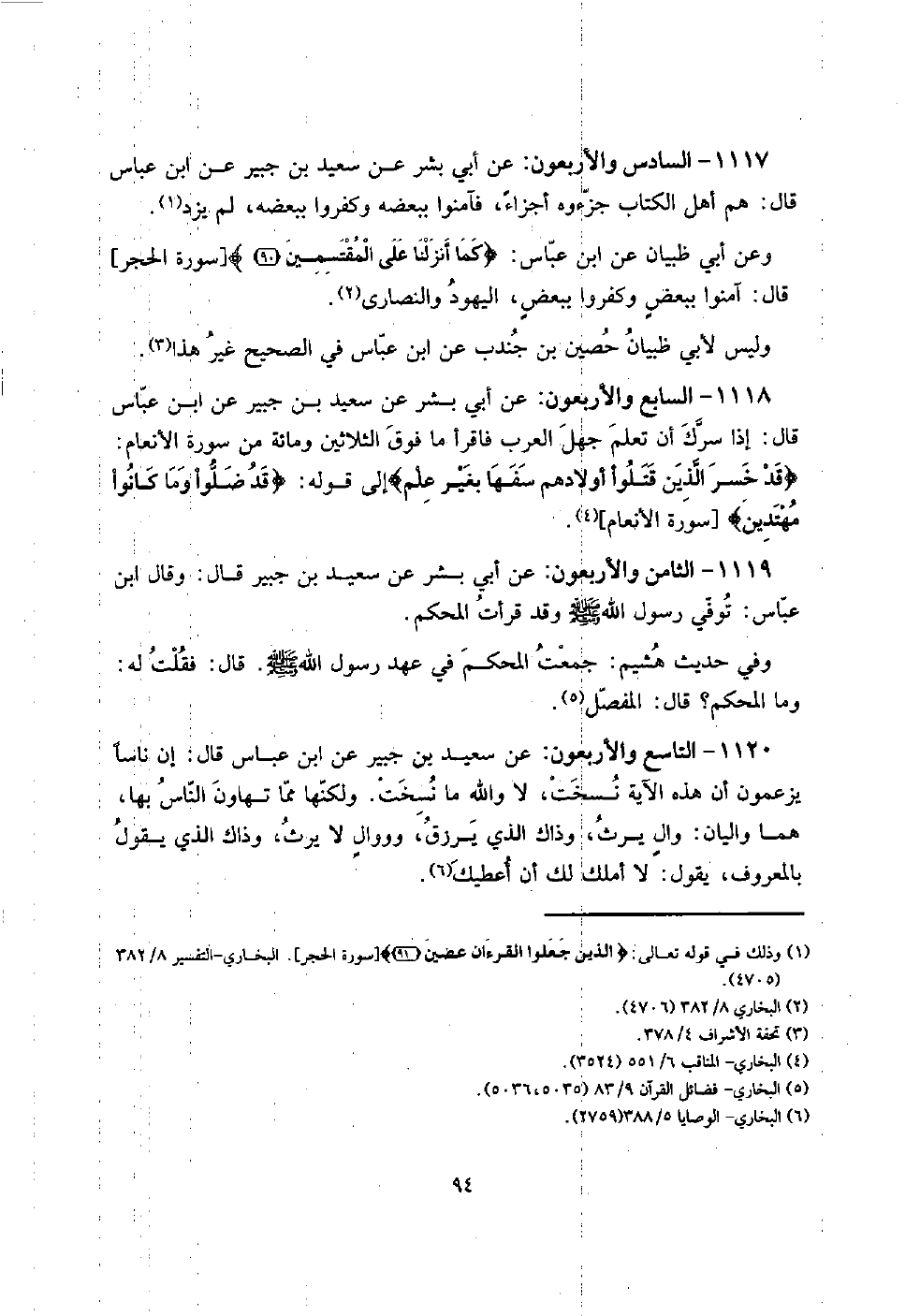 1119 - الثَّامِن وَالْأَرْبَعُونَ: عَن أبي بشر عَن سعيد بن جُبَير قَالَ: وَقَالَ ابْن عَبَّاس: توفّي رَسُول الله صلى الله عَلَيْهِ وَسلم وَقد قَرَأت الْمُحكم.