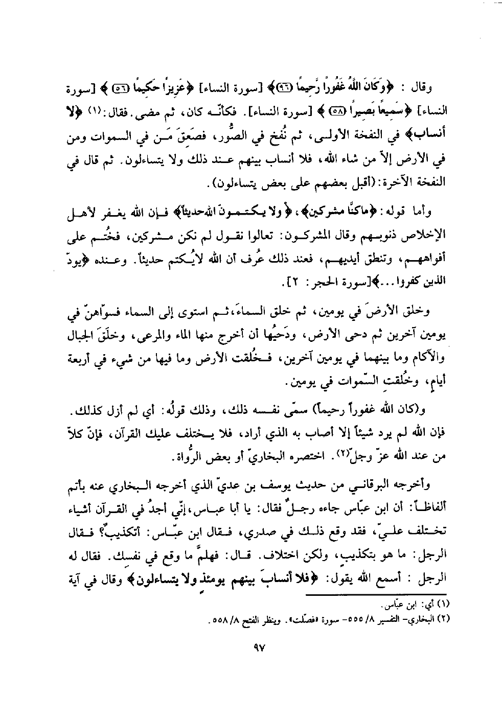 وَقَالَ: {وَكَانَ الله غَفُورًا رحِيما} [سُورَة النِّسَاء] {عَزِيزًا حكيما} [سُورَة النِّسَاء] {سمعياً بَصيرًا} [سُورَة النِّسَاء] . فَكَأَنَّهُ كَانَ، ثمَّ مضى. فَقَالَ: {لَا أَنْسَاب} فِي النفخة الأولى، ثمَّ نفخ فِي الصُّور، فَصعِقَ من فِي السَّمَوَات وَمن فِي الأَرْض إِلَّا من شَاءَ الله، فَلَا أَنْسَاب بَينهم عِنْد ذَلِك وَلَا يتساءلون. ثمَّ قَالَ فِي النفخة الْآخِرَة: (أقبل بَعضهم على بعض يتساءلون) .