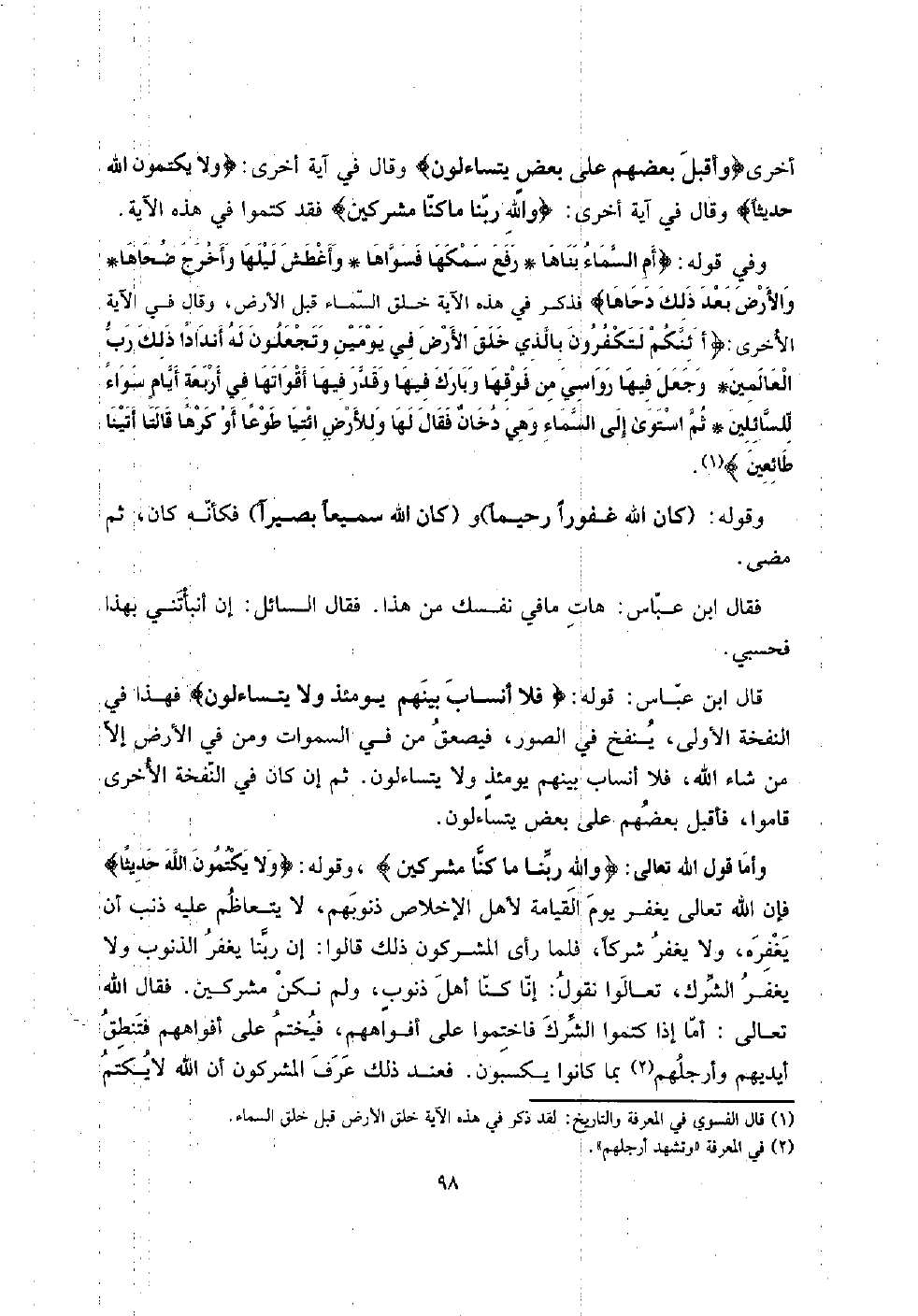 قَالَ ابْن عَبَّاس: قَوْله: {فَلَا أَنْسَاب بَينهم يَوْمئِذٍ وَلَا يتساءلون} فَهَذَا فِي النفخة الأولى، ينْفخ فِي الصُّور، فيصعق من فِي السَّمَوَات وَمن فِي الأَرْض إِلَّا من شَاءَ الله، فَلَا أَنْسَاب بَينهم يومئذٍ وَلَا يتساءلون. ثمَّ إِن كَانَ فِي النفخة الْأُخْرَى قَامُوا، فَأقبل بَعضهم على بعض يتساءلون.