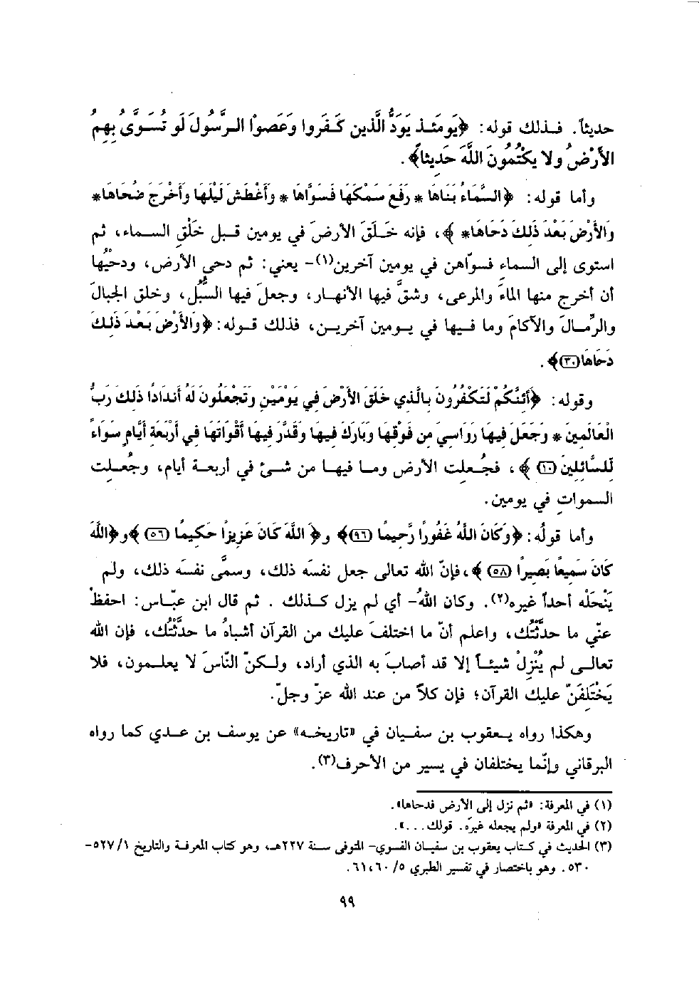 وَأما قَوْله: {السَّمَاء بناها رفع سمكها فسواها وأغطش لَيْلهَا وَأخرج ضحاها وَالْأَرْض بعد ذَلِك دحاها} ، فَإِنَّهُ خلق الأَرْض فِي يَوْمَيْنِ قبل خلق السَّمَاء، ثمَّ اسْتَوَى إِلَى السَّمَاء فسواهن فِي يَوْمَيْنِ آخَرين - يَعْنِي: ثمَّ دحى الأَرْض، ودحيها أَن أخرج مِنْهَا المَاء والمرعى، وشق فِيهَا الْأَنْهَار، وَجعل فِيهَا السبل، وَخلق الْجبَال والرمال والآكام وَمَا فِيهَا فِي يَوْمَيْنِ آخَرين، فَذَلِك قَوْله: {وَالْأَرْض بعد ذَلِك دحاها} {وَقَوله} (أئنكم لتكفرون بِالَّذِي خلق الأَرْض فِي يَوْمَيْنِ وتجعلون لَهُ أنداداً ذَلِك رب الْعَالمين وَجعل فِيهَا رواسي من فَوْقهَا وَبَارك فِيهَا وَقدر فِيهَا أقواتها فِي أَرْبَعَة أيامٍ سَوَاء للسائلين} ، فَجعلت الأَرْض وَمَا فِيهَا من شئ فِي أَرْبَعَة أَيَّام، وَجعلت السَّمَوَات فِي يَوْمَيْنِ.