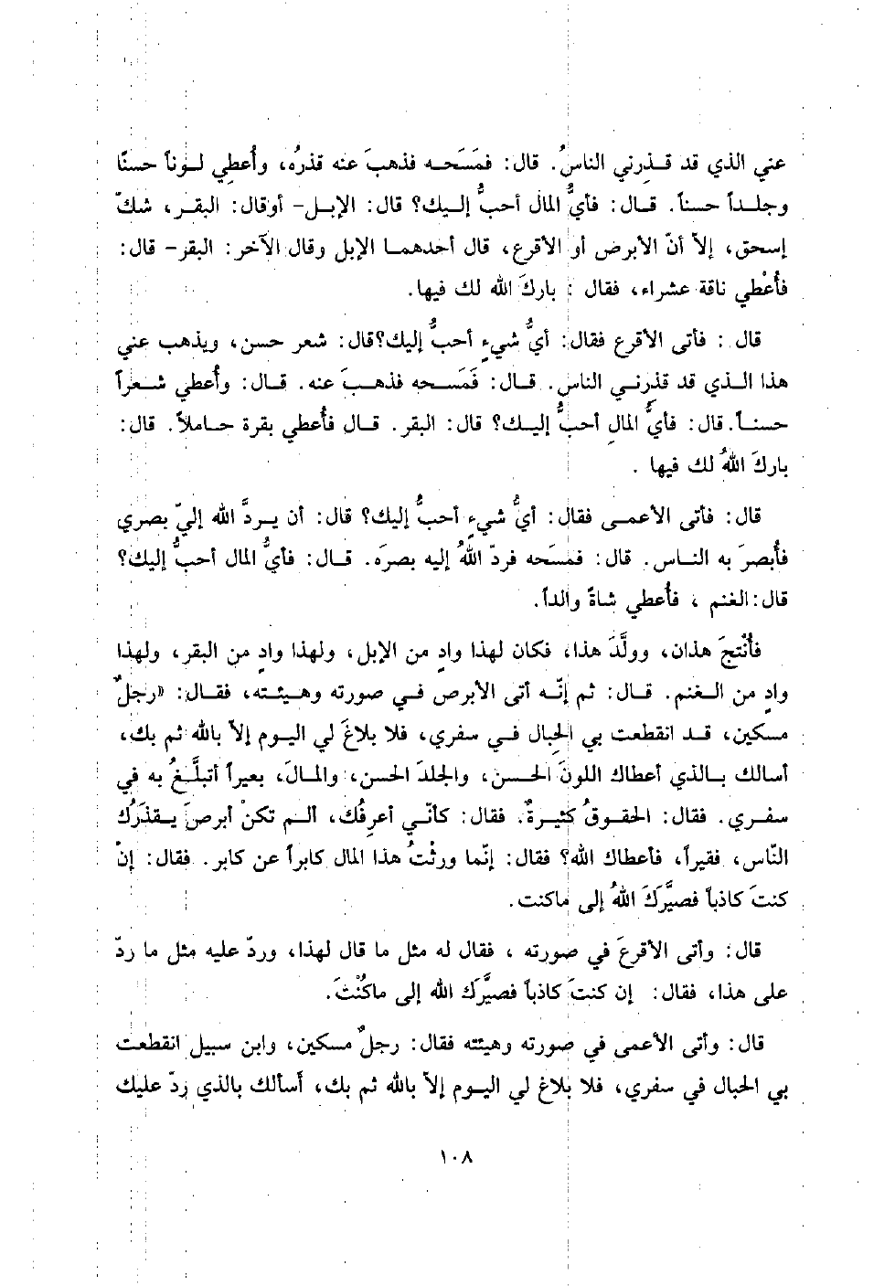 رجلٌ مِسْكين، قد انْقَطَعت بِي الحبال فِي سَفَرِي، فَلَا بَلَاغ لي الْيَوْم إِلَّا بِاللَّه ثمَّ بك، أَسأَلك بِالَّذِي أَعْطَاك اللَّوْن الْحسن، وَالْجَلد الْحسن، وَالْمَال، بَعِيرًا أتبلغ بِهِ فِي سَفَرِي. فَقَالَ: الْحُقُوق كثيرةٌ. فَقَالَ: كَأَنِّي أعرفك، ألم تكن أبرص يقذرك النَّاس، فَقِيرا، فأعطاك الله؟ فَقَالَ: إِنَّمَا ورثت هَذَا المَال كَابِرًا عَن كَابر. فَقَالَ: إِن كنت كَاذِبًا فصيرك الله إِلَى مَا كنت.