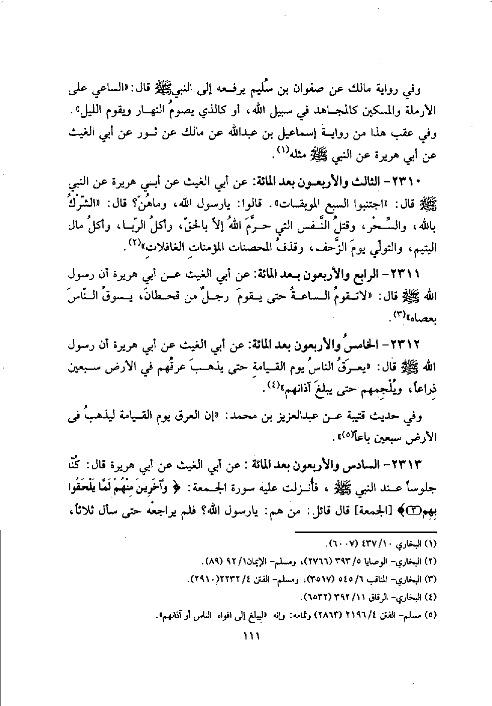 2310 - الثَّالِث وَالْأَرْبَعُونَ بعد الْمِائَة: عَن أبي الْغَيْث عَن أبي هُرَيْرَة عَن النَّبِي صلى الله عَلَيْهِ وَسلم قَالَ: " اجتنبوا السَّبع الموبقات ". قَالُوا: يَا رَسُول الله، وَمَا هن؟ قَالَ: " الشّرك بِاللَّه، وَالسحر، وَقتل النَّفس الَّتِي حرم الله إِلَّا بِالْحَقِّ، وَأكل الرِّبَا وَأكل مَال الْيَتِيم، والتولي يَوْم الزَّحْف، وَقذف الْمُحْصنَات الْمُؤْمِنَات الْغَافِلَات ".