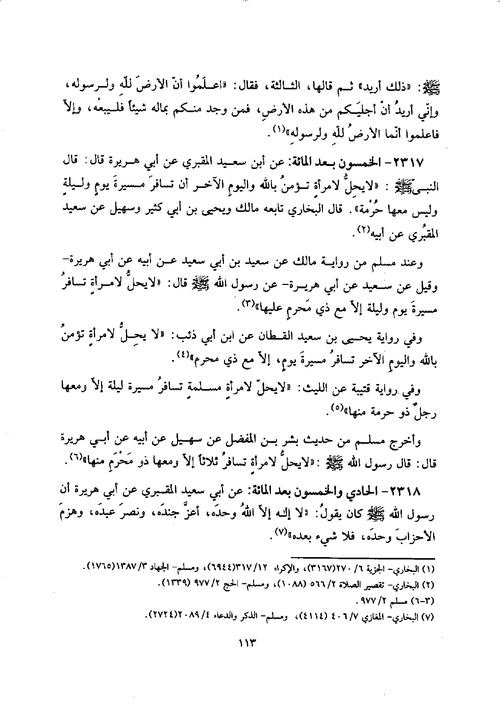 2317 - الْخَمْسُونَ بعد الْمِائَة: عَن أبن سعيد المَقْبُري عَن أبي هُرَيْرَة قَالَ: قَالَ النَّبِي صلى الله عَلَيْهِ وَسلم: " لَا يحل لامرأةٍ تؤمن بِاللَّه وَالْيَوْم الآخر أَن تُسَافِر مسيرَة يومٍ وليلةٍ وَلَيْسَ مَعهَا حُرْمَة ". قَالَ البُخَارِيّ تَابعه مَالك وَيحيى بن أبي كثير وَسُهيْل عَن سعيد المَقْبُري عَن أَبِيه.
