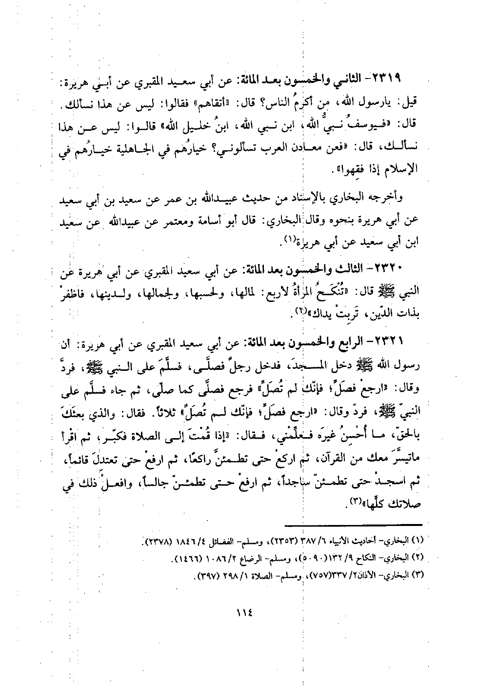 2321 - الرَّابِع وَالْخَمْسُونَ بعد الْمِائَة: عَن أبي سعيد المَقْبُري عَن أبي هُرَيْرَة: أَن رَسُول الله صلى الله عَلَيْهِ وَسلم دخل الْمَسْجِد، فَدخل رجلٌ فصلى، فَسلم على النَّبِي صلى الله عَلَيْهِ وَسلم، فَرد وَقَالَ: " ارْجع فصل؛ فَإنَّك لم تصل " فَرجع فصلى كَمَا صلى، ثمَّ جَاءَ فَسلم على النَّبِي صلى الله عَلَيْهِ وَسلم، فَرد وَقَالَ: " ارْجع فصل؛ فَإنَّك لم تصل " ثَلَاثًا. فَقَالَ: وَالَّذِي بَعثك بِالْحَقِّ، مَا أحسن غَيره فعلمني، فَقَالَ: " إِذا قُمْت إِلَى الصَّلَاة فَكبر، ثمَّ اقْرَأ مَا تيَسّر مَعَك من الْقُرْآن، ثمَّ اركع حَتَّى تطمئِن رَاكِعا، ثمَّ ارْفَعْ حَتَّى تعتدل قَائِما، ثمَّ اسجد حَتَّى تطمئِن سَاجِدا، ثمَّ ارْفَعْ حَتَّى تطمئِن جَالِسا، وَافْعل ذَلِك فِي صَلَاتك كلهَا ".