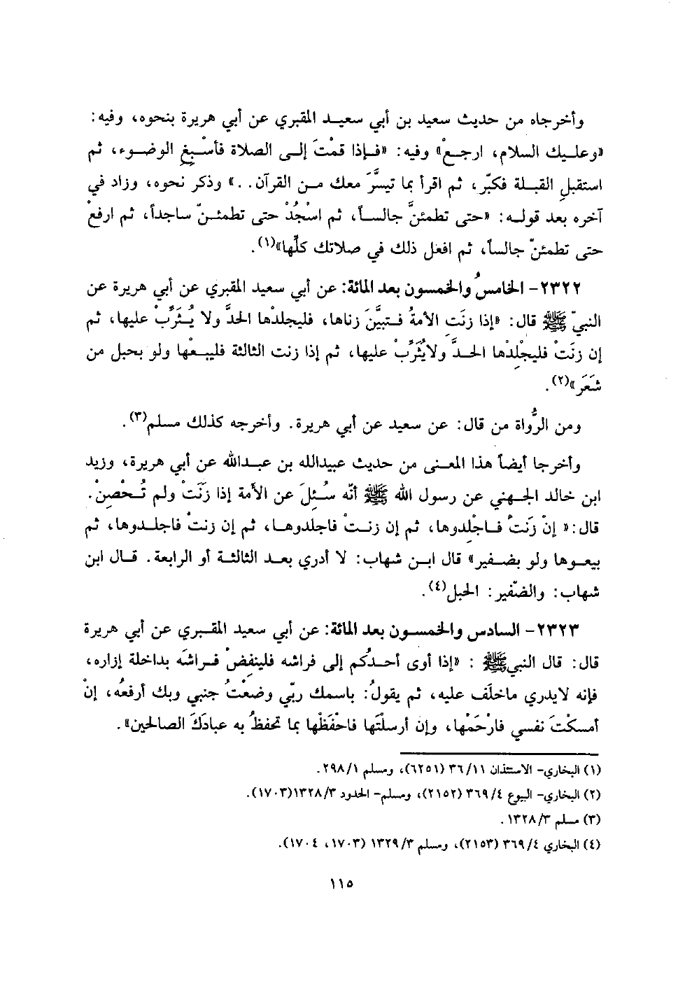 2322 - الْخَامِس وَالْخَمْسُونَ بعد الْمِائَة: عَن أبي سعيد المَقْبُري عَن أبي هُرَيْرَة عَن النَّبِي صلى الله عَلَيْهِ وَسلم قَالَ: " إِذا زنت الْأمة فَتبين زنَاهَا، فليجلدها الْحَد وَلَا يثرب عَلَيْهَا، ثمَّ إِن زنت فليجلدها الْحَد وَلَا يثرب عَلَيْهَا، ثمَّ إِذا زنت الثَّالِثَة فليبعها وَلَو بِحَبل من شعر ".