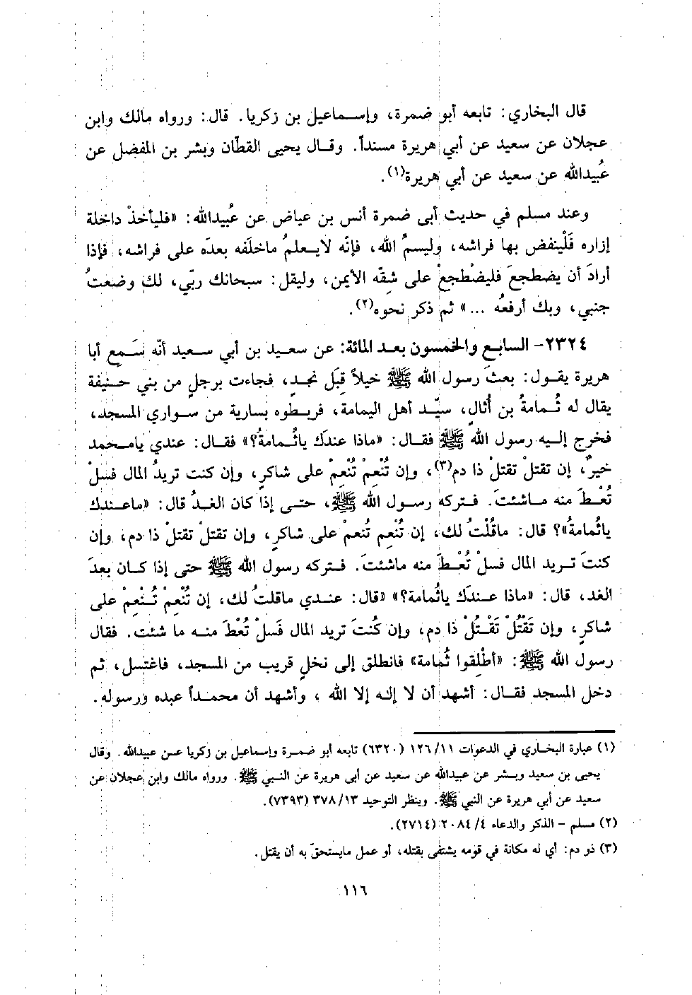 2324 - السَّابِع وَالْخَمْسُونَ بعد الْمِائَة: عَن سعيد بن أبي سعيد أَنه سمع أَبَا هُرَيْرَة يَقُول: بعث رَسُول الله صلى الله عَلَيْهِ وَسلم خيلاً قبل نجدٍ، فَجَاءَت برجلٍ من بني حنيفَة يُقَال لَهُ ثُمَامَة بن أثالٍ، سيد أهل الْيَمَامَة، فربطوه بِسَارِيَة من سواري الْمَسْجِد، فَخرج إِلَيْهِ رَسُول الله صلى الله عَلَيْهِ وَسلم فَقَالَ: " مَاذَا عنْدك يَا ثُمَامَة؟ " فَقَالَ: عِنْدِي يَا مُحَمَّد خيرٌ، إِن تقتل تقتل ذَا دم، وَإِن تنعم تنعم على شاكرٍ، وَإِن كنت تُرِيدُ المَال فسل تعط مِنْهُ مَا شِئْت. فَتَركه رَسُول الله صلى الله عَلَيْهِ وَسلم، حَتَّى إِذا كَانَ الْغَد قَالَ: " مَا عنْدك يَا ثُمَامَة "؟ قَالَ: مَا قلت لَك، إِن تنعم تنعم على شاكرٍ، وَإِن تقتل تقتل ذَا دم، وَإِن كنت تُرِيدُ المَال فسل تعط مِنْهُ مَا شِئْت. فَتَركه رَسُول الله صلى الله عَلَيْهِ وَسلم حَتَّى إِذا كَانَ بعد الْغَد، قَالَ: مَاذَا عنْدك يَا ثُمَامَة؟ " " قَالَ: عِنْدِي مَا قلت لَك، إِن تنعم تنعم على شاكرٍ، وَإِن تقتل تقتل ذَا دم، وَإِن كنت تُرِيدُ المَال فسل تعط مِنْهُ مَا شِئْت. فَقَالَ رَسُول الله صلى الله عَلَيْهِ وَسلم: " أطْلقُوا ثُمَامَة " فَانْطَلق إِلَى نخلٍ قريب من الْمَسْجِد، فاغتسل، ثمَّ دخل الْمَسْجِد فَقَالَ: أشهد أَن لَا إِلَه إِلَّا الله، وَأشْهد أَن مُحَمَّدًا عَبده وَرَسُوله.