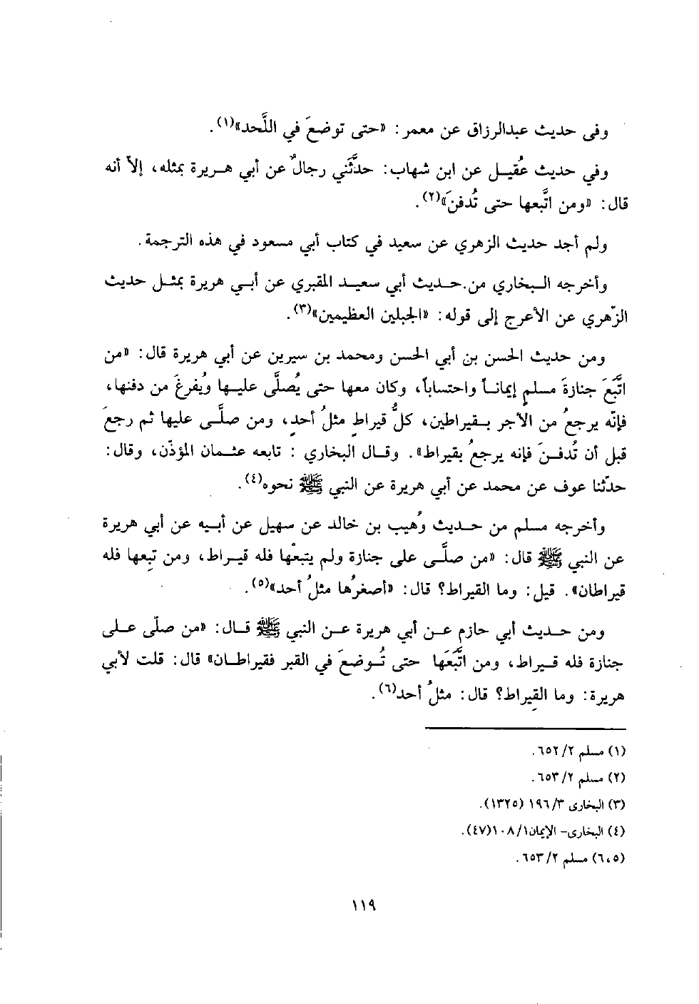 من اتبع جَنَازَة مسلمٍ إِيمَانًا واحتساباً، وَكَانَ مَعهَا حَتَّى يصلى عَلَيْهَا ويفرغ من دَفنهَا، فَإِنَّهُ يرجع من الْأجر بقيراطين، كل قيراطٍ مثل أحدٍ، وَمن صلى عَلَيْهَا ثمَّ رَجَعَ قبل أَن تدفن فَإِنَّهُ يرجع بقيراط ". وَقَالَ البُخَارِيّ: تَابعه عُثْمَان الْمُؤَذّن، وَقَالَ: حَدثنَا عَوْف عَن مُحَمَّد عَن أبي هُرَيْرَة عَن النَّبِي صلى الله عَلَيْهِ وَسلم نَحوه.